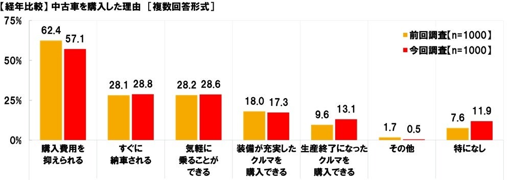 はじめに、全回答者(1,000名)に、中古車を購入した理由を聞いたところ、「購入費用を抑えられる」(57.1%)が突出して高くなりました。次いで高かったのは、「すぐに納車される」(28.8%)、「気軽に乗ることができる」(28.6%)、「装備が充実したクルマを購入できる」(17.3%)、「生産終了になったクルマを購入できる」(13.1%)でした。