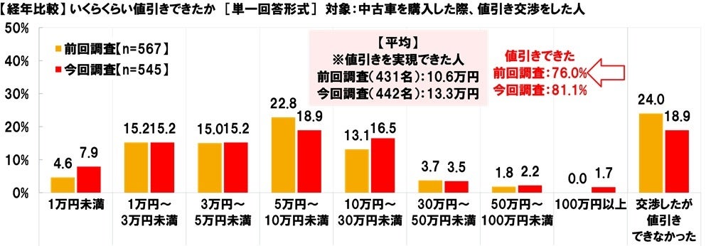 前回調査と比べると、「値引きできた」は76.0%→81.1%と5.1ポイント上昇し、平均金額(10.6万円→13.3万円)は2.7万円上昇しました。