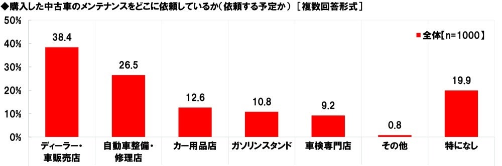全回答者(1,000名)に、購入した中古車のメンテナンスをどこに依頼しているか(依頼する予定か)聞いたところ、「ディーラー・車販売店」(38.4%)が最も高くなりました。次いで高くなったのは、「自動車整備・修理店」(26.5%)、「カー用品店」(12.6%)、「ガソリンスタンド」(10.8%)、「車検専門店」(9.2%)でした。