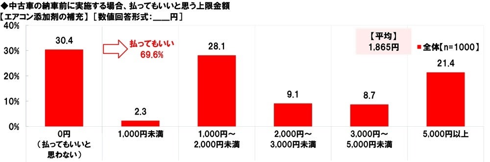 【エアコン添加剤の補充】では、「払ってもいい」は69.6%、「0円(払ってもいいと思わない)」は30.4%となりました。払ってもいいと思う上限金額は「1,000円~2,000円未満」(28.1%)や「5,000円以上」(21.4%)に回答が分かれ、平均は1,865円でした。
