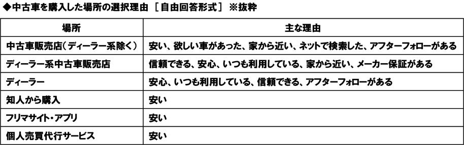 購入場所として「中古車販売店(ディーラー系除く)」を選択した理由をみると、「安い」や「欲しい車があった」などが挙げられました。また、「ディーラー系中古車販売店」を選択した理由では「信頼できる」や「安心」、「ディーラー」を選択した理由では「いつも利用している」や「アフターフォローがある」などが挙げられました。