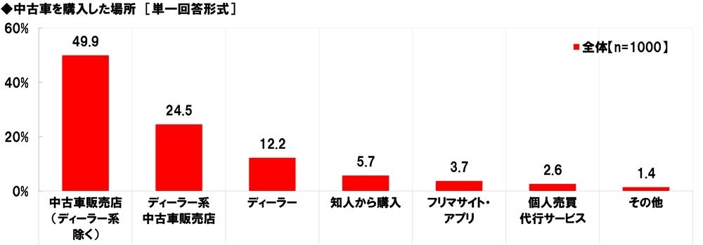 中古車を購入した場所を聞いたところ、「中古車販売店(ディーラー系除く)」(49.9%)が最も高くなり、「ディーラー系中古車販売店」(24.5%)、「ディーラー」(12.2%)、「知人から購入」(5.7%)、「フリマサイト・アプリ」(3.7%)が続きました。