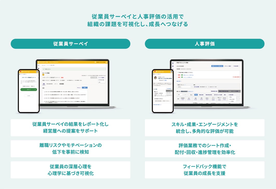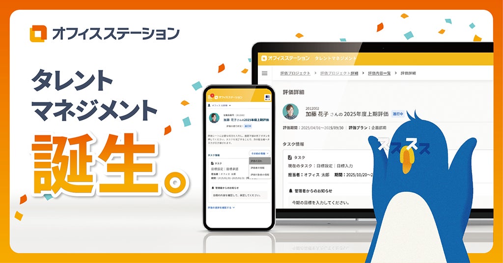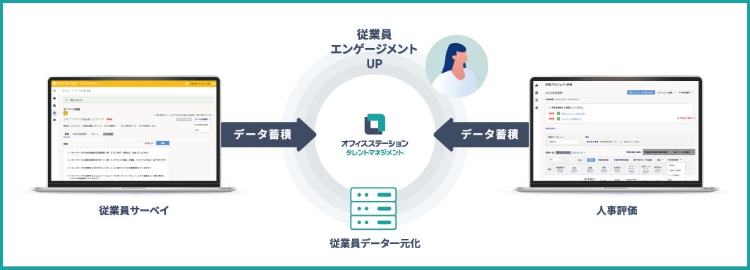 「オフィスステーション タレントマネジメント」は、第一弾のリリース※2として、人事評価と従業員サーベイの機能を提供し、従業員一人ひとりの成長と組織全体の成果を両立する戦略的な人材マネジメントの実現を支援します。