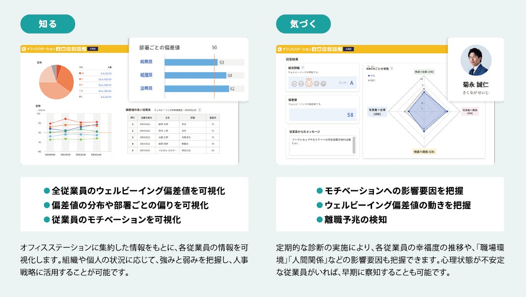 また、日本初※1となる心理学に基づくウェルビーイング診断機能も統合して搭載。立命館大学 総合心理学部の髙橋潔教授との産学連携で開発された独自指標「ウェルビーイング指数」により、従業員の心理状態を定量的に可視化し、人的資本経営における新たな意思決定の機会を提供します。