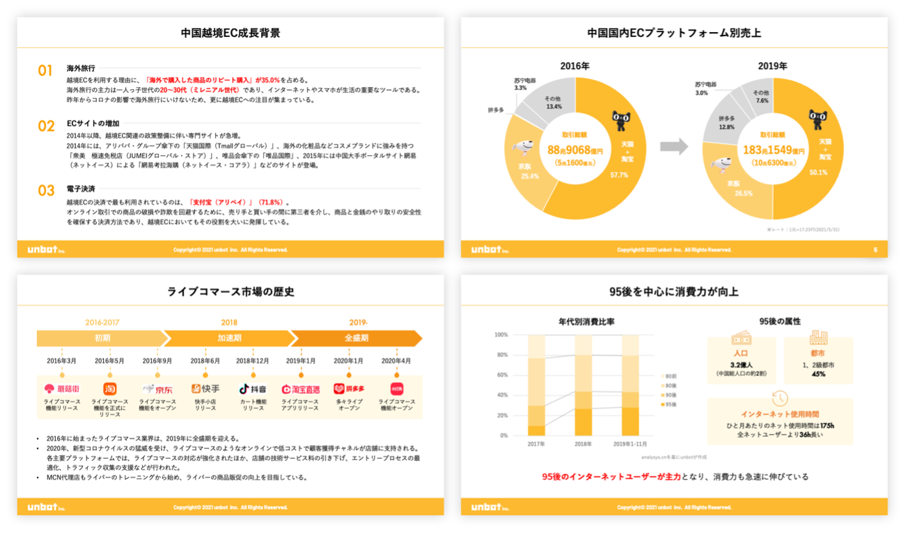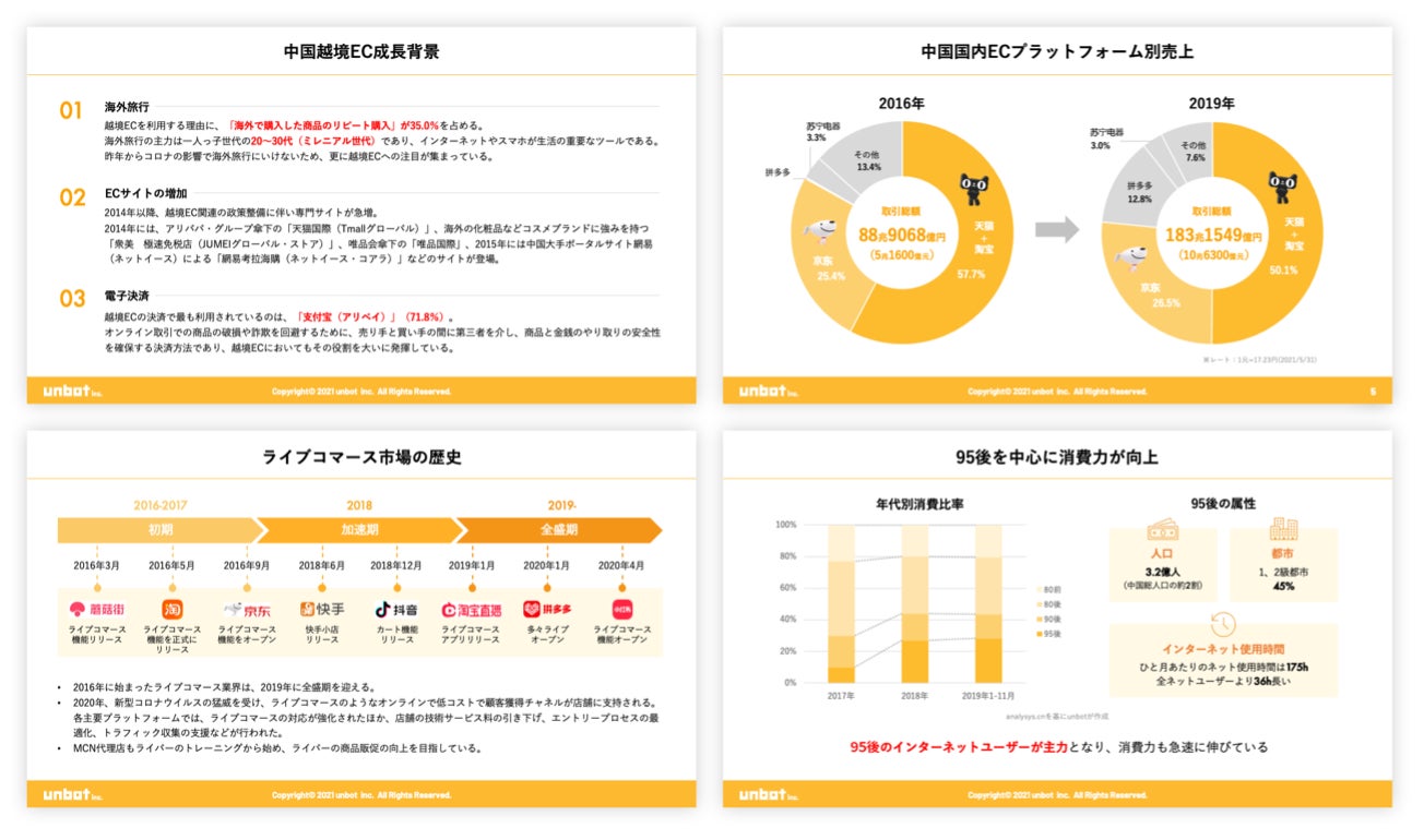 中国・東南アジア市場向けにEC店舗運営支援を行う、株式会社unbot(本社:東京都品川区、代表取締役社長:中町秀慶 )は、2022年10月に、ブランド様の中国EC担当者、中華圏デジタルマーケティングに携わる方向けに、中国デジタルマーケティングに関する初の有料レポート「中国における最新のEC&SNS市場動向(2022)(仮)」を販売することをお知らせいたします。