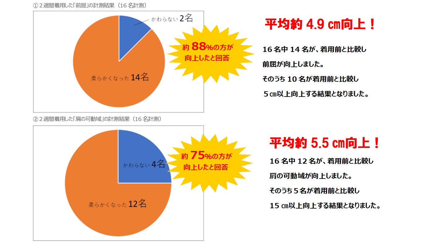 結果、立位体前屈は平均で約4.9cm、肩の可動域は平均で約5.5cmの向上を示しました。特に、肩こり、腰痛、膝痛などの身体の不調を抱える被験者の大半が、着用前と比較して不調が緩和されるという結果となりました。さらに、仕事に関する不調も改善が確認され、多くの被験者が仕事を楽に感じ、日々の疲労感が軽減されたと答えました。