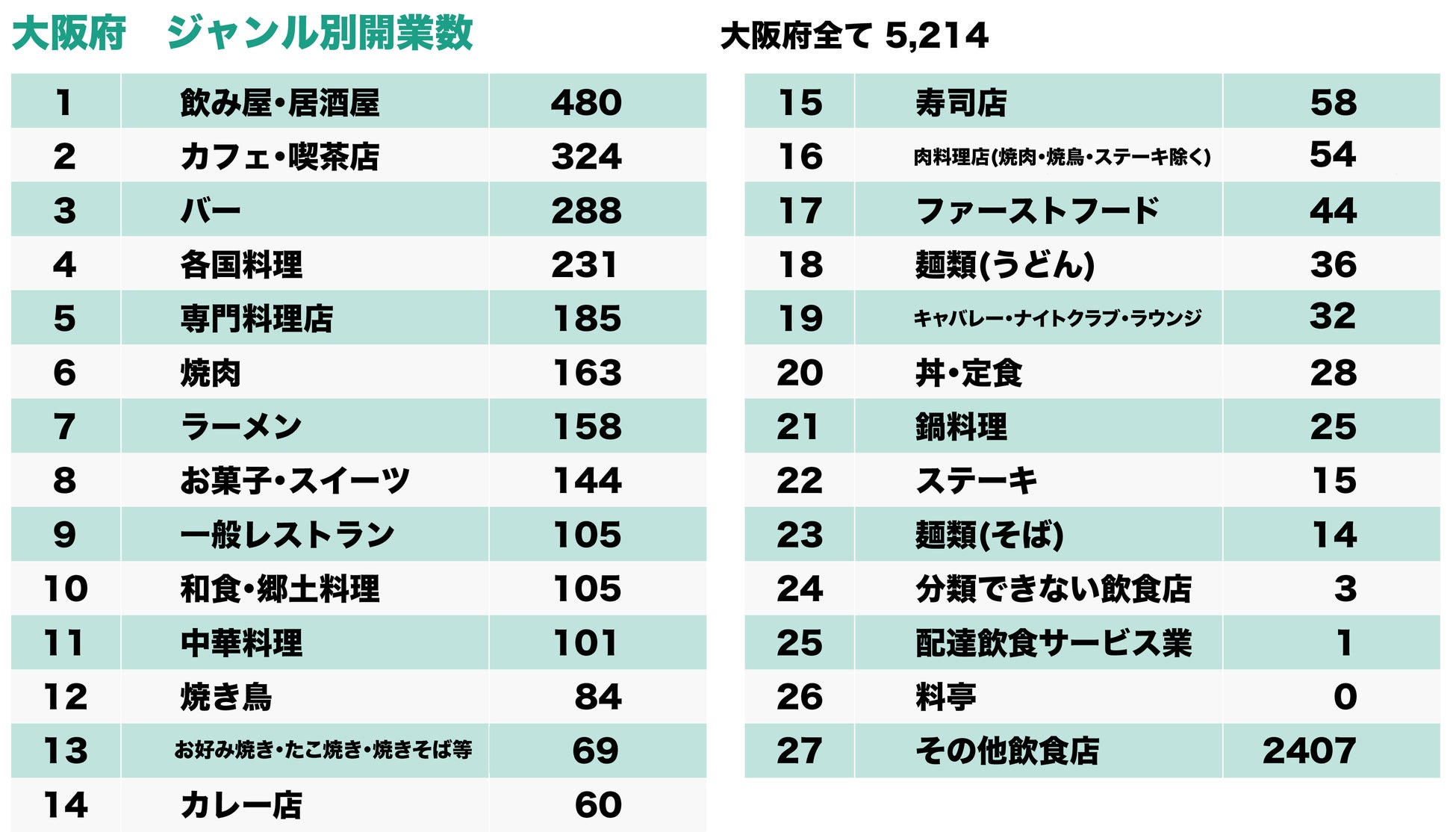 <大阪府 飲食店ジャンル別開業数ランキング>
