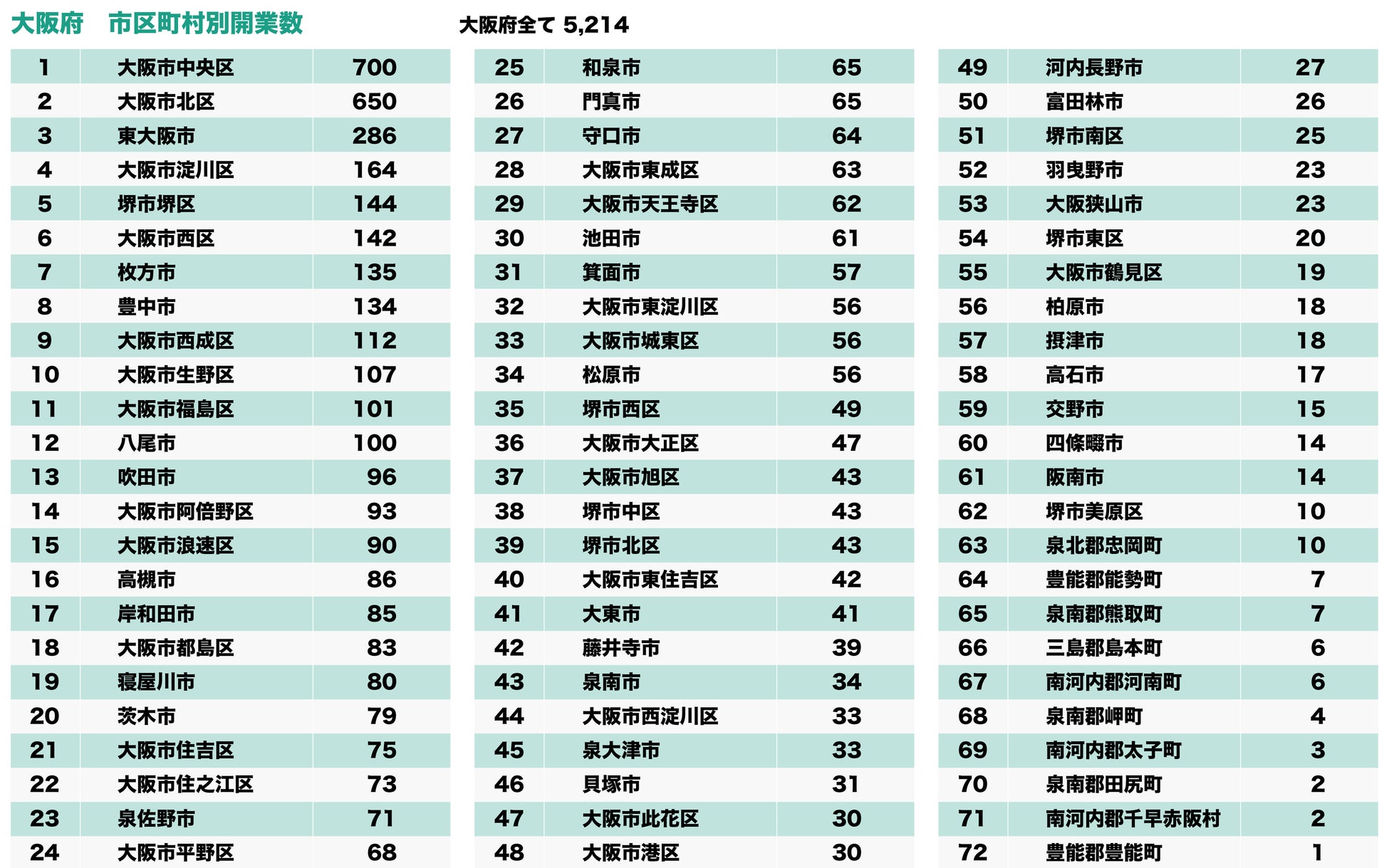 2024年、大阪府全体で飲食店5,214件が新規開業し、市区町村別・業態別の開業数ランキングは以下のような結果となりました。