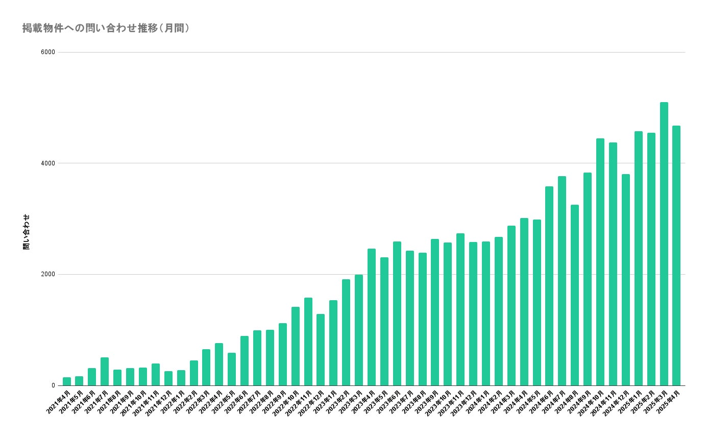 これまで、関東エリアにおいて70,000人以上のユーザー様にご支持いただき、掲載物件数や物件へのお問い合わせも順調に増加しております。