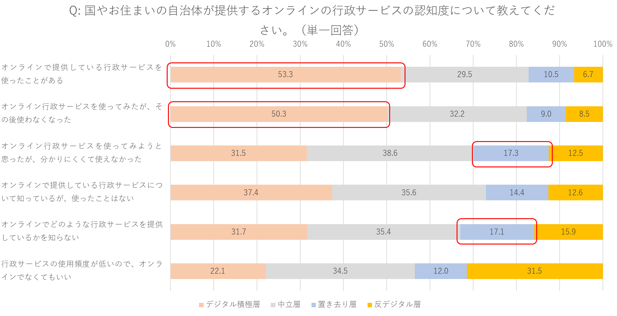 「使ってみようと思ったが分かりにくくて使えなかった」「オンラインでどのような行政サービスを提供しているか知らない」と回答した人では、「置き去り層」の占める割合が約2割を占めた。