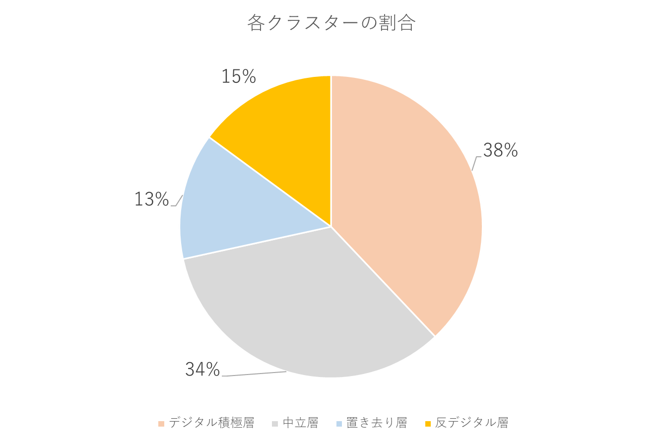 - 【デジタル積極層】:デジタル化に肯定的な意見を持っていて、自分自身がデジタル化の進展についていけていると回答した人(38%)