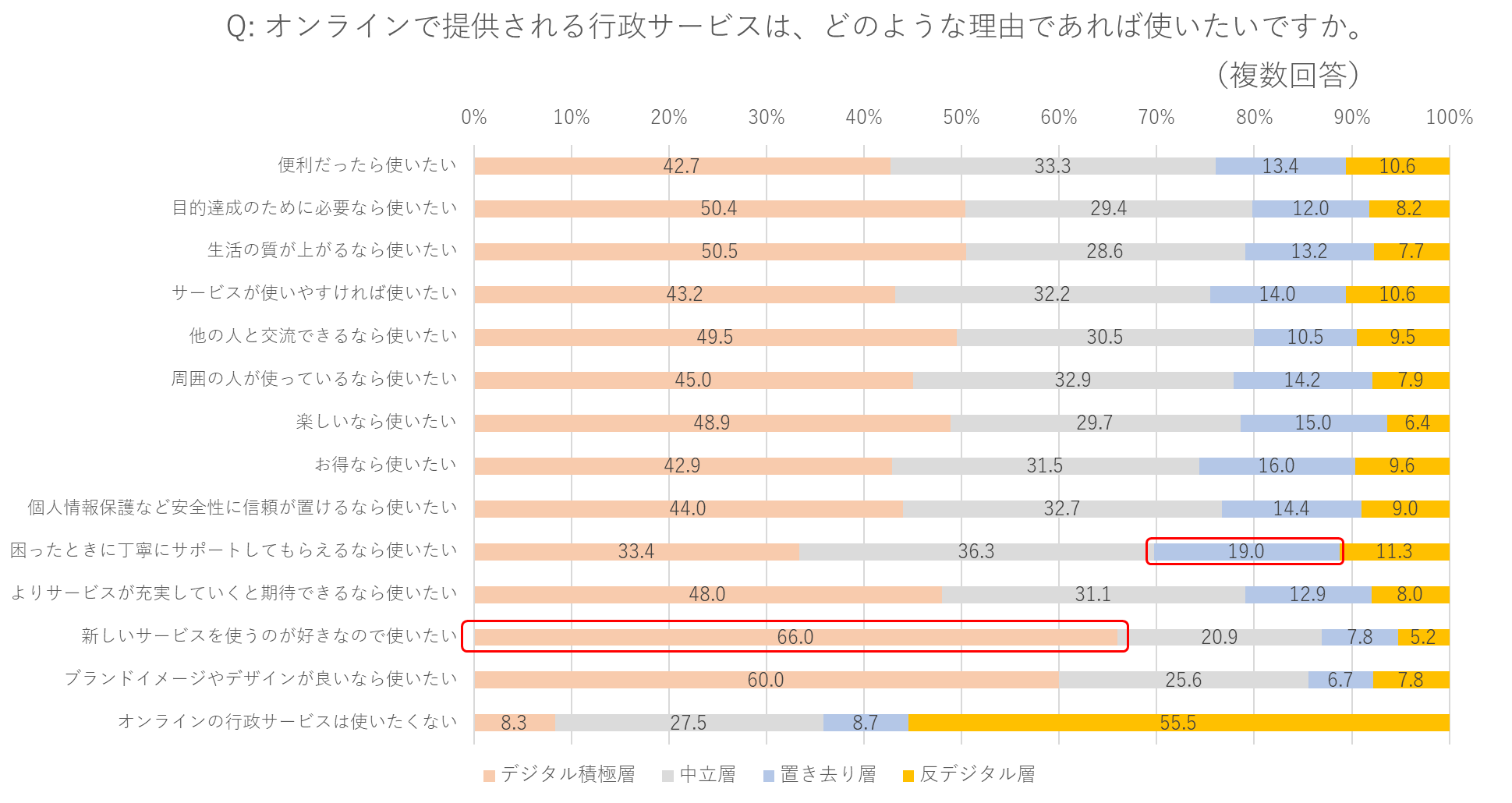 - 行政のオンラインサービスを使う理由について、「デジタル積極層」の割合が最も高くなった回答項目は「新しいサービスを使うのが好きだから」となり、この傾向は上記の民間オンラインサービスを日ごろよく使う理由と同じであった。一方で「置き去り層」の割合が最も高くなった回答項目は「困った時に丁寧にサポートしてくれるなら使いたい」だった。
