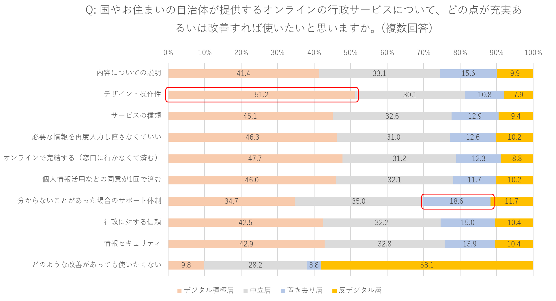 どの点が充実・改善されれば使いたいと思うかという質問に対して、「デジタル積極層」の占める割合が高かった回答項目は「デザイン・操作性」であった(図)。この回答を踏まえ、行政オンラインサービスにおけるUI・UXの改善を継続的に行うことで、まずは「デジタル積極層」の人々にオンラインサービスのファンになってもらうことが重要だと考えられる。