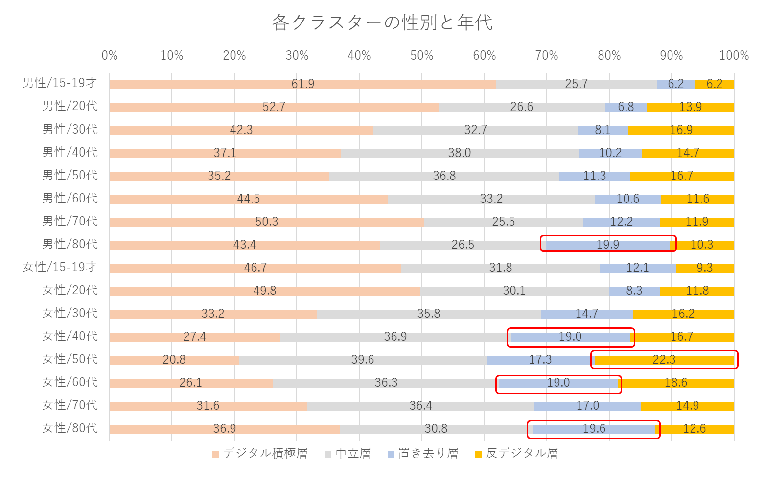 また、「反デジタル層」において最も多い割合である2割を超えたのは女性50代であった。
