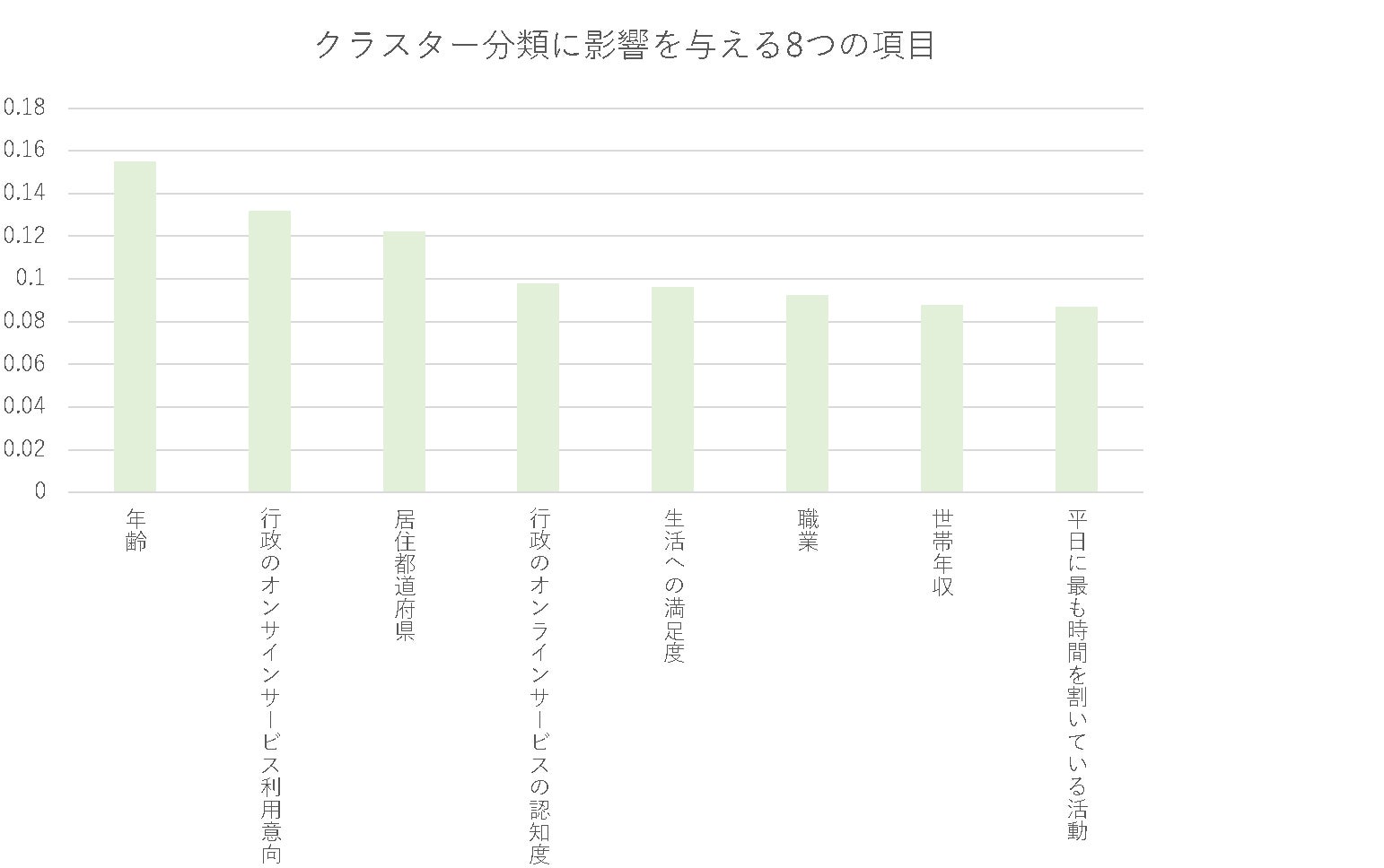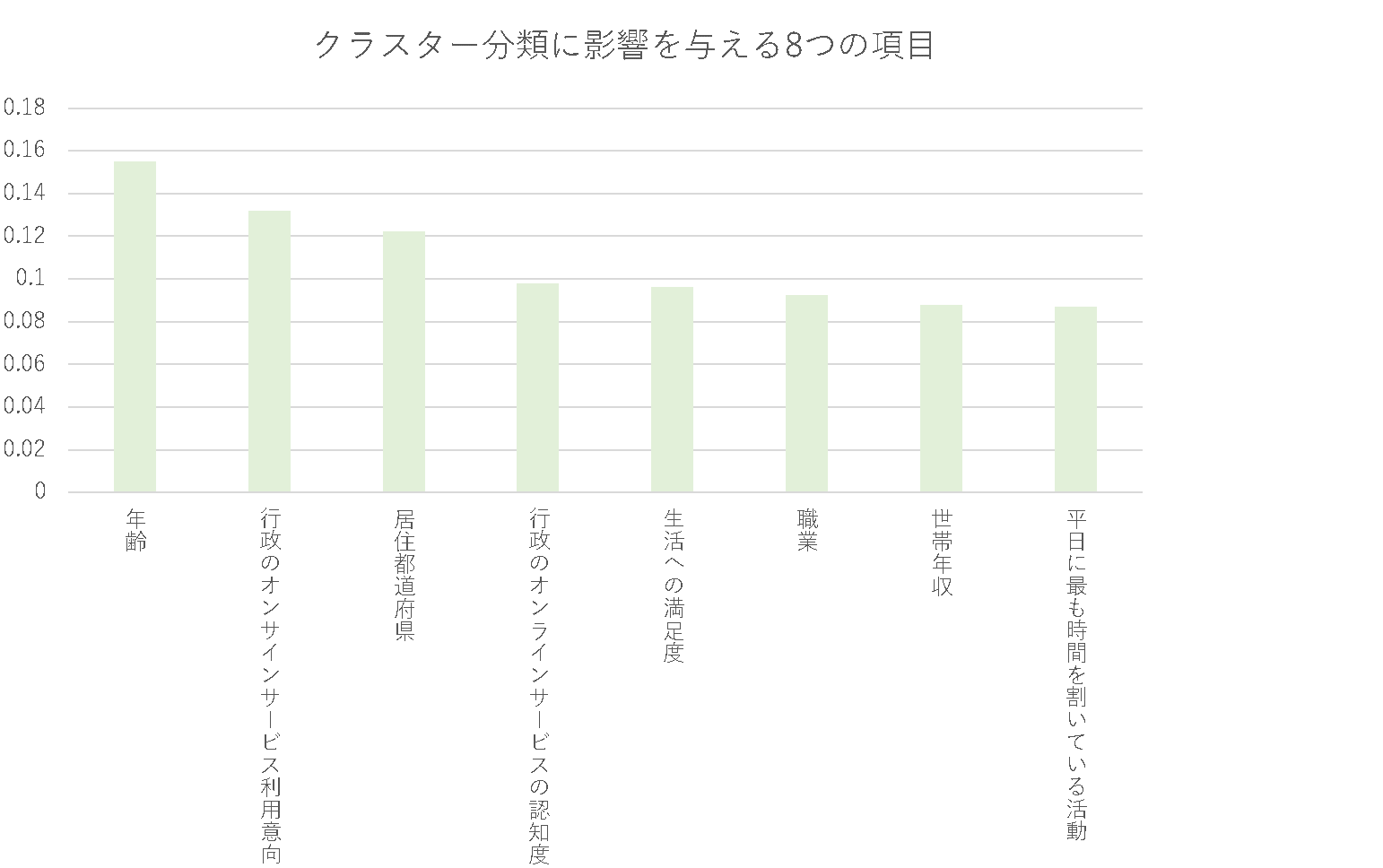 社会のデジタル化への意識分類に影響を与える項目を、機械学習の一種であるランダムフォレストを用いた分析(※2)により抽出したところ、「年齢」「行政のオンラインサービス利用意向」「居住地域」「行政オンラインサービスの認知度」「生活への満足度」「職業」「世帯年収」「1日(平日)に最も時間を割いている活動」などが上位となった(図)。