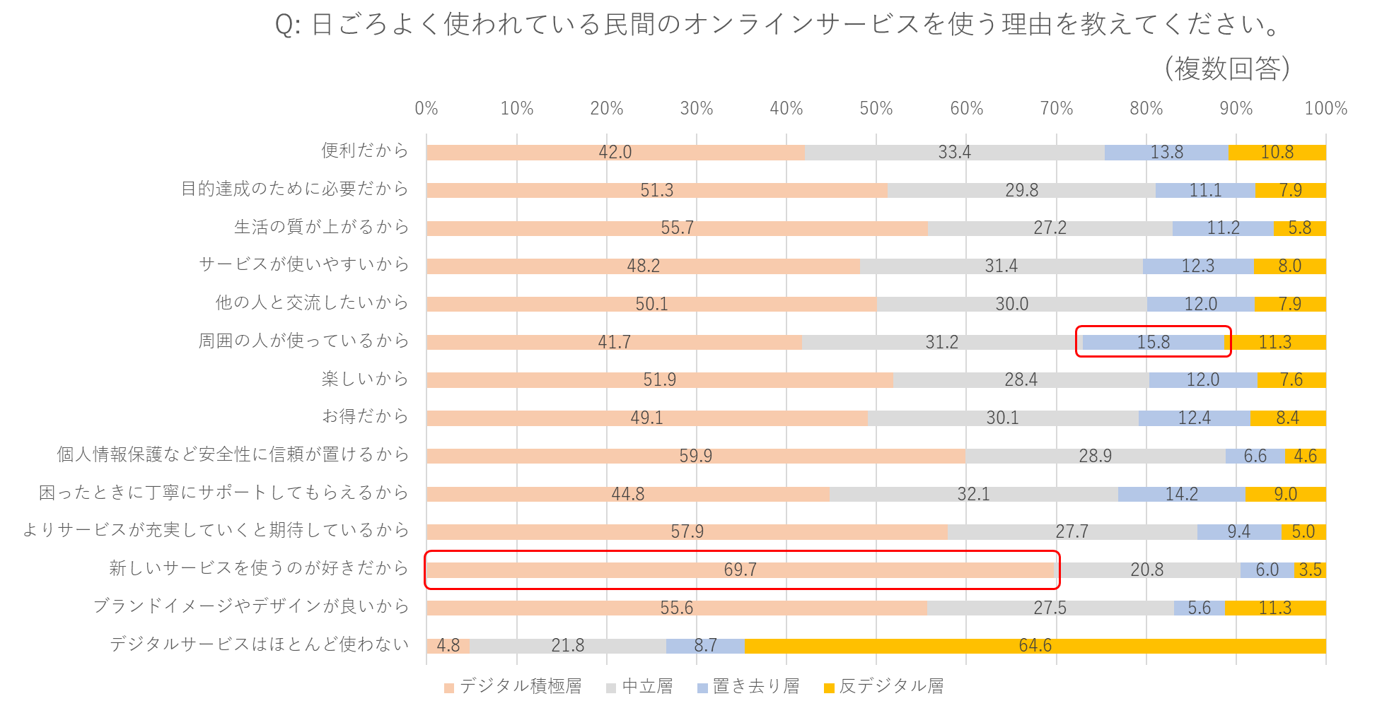- 民間のオンラインサービスを日ごろよく使う理由について、「デジタル積極層」の割合が最も高くなった回答項目は「新しいサービスを使うのが好きだから」だった。「置き去り層」の割合が最も高くなった回答項目は「周りの人が使っているから」だった。