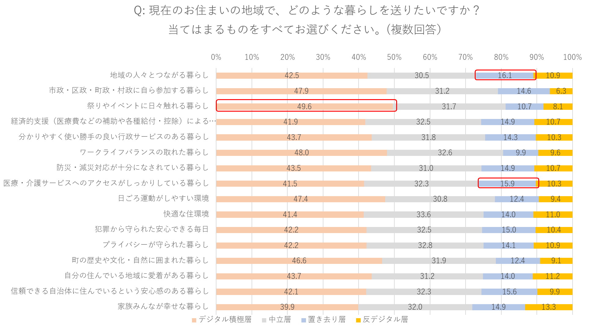 理想の生活について尋ねたところ、「デジタル積極層」の割合が高かった回答項目は「祭りやイベントに触れる暮らし」「ワークライフバランス」、「置き去り層」の割合が高かったのは「地域の人とつながる暮らし」「医療・介護サービスへのアクセスがしっかりしている暮らし」、「反デジタル層」の割合が高かったのは「家族みんなが幸せな暮らし」となった(図)。