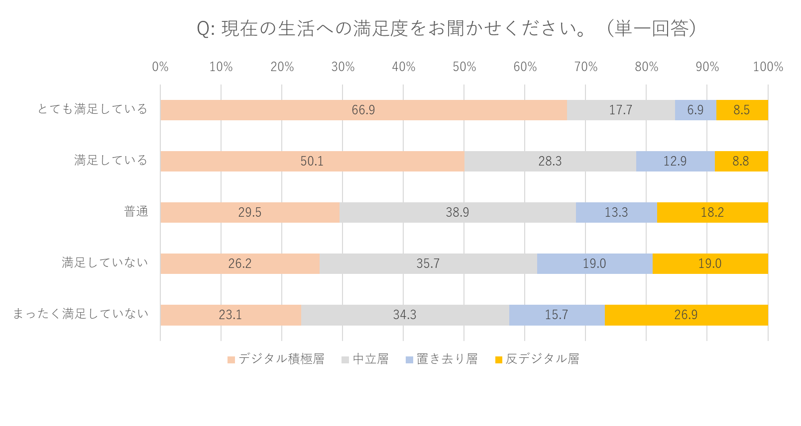 満足度が高いほど「デジタル積極層」の占める割合が高くなり、満足度が低いほど「反デジタル層」の占める割合が高くなることが分析結果からも分かった。