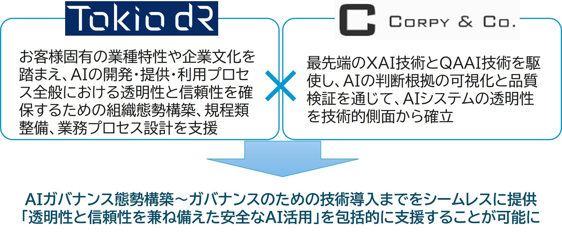 このような状況を踏まえ、AIガバナンス構築・リスクアセスメントソリューションを提供するTdRとAIの安全性・説明可能性・透明性を向上させるソリューションを提供するコーピーは、日本企業のAI活用促進に貢献するために戦略的業務提携を開始しました。
