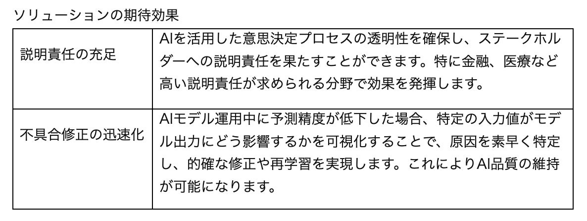 本提携では、コーピーが持つXAI(説明可能AI)技術とQAAI(AI向け品質検証)技術を活用し、以下の3つの価値を企業に提供します。