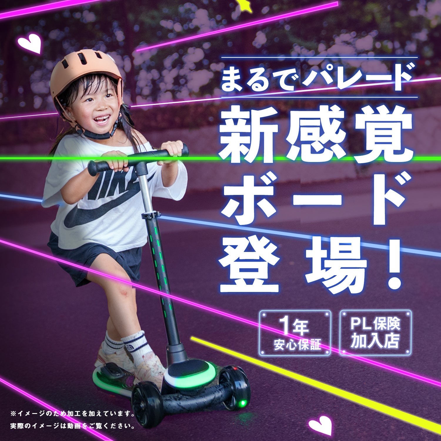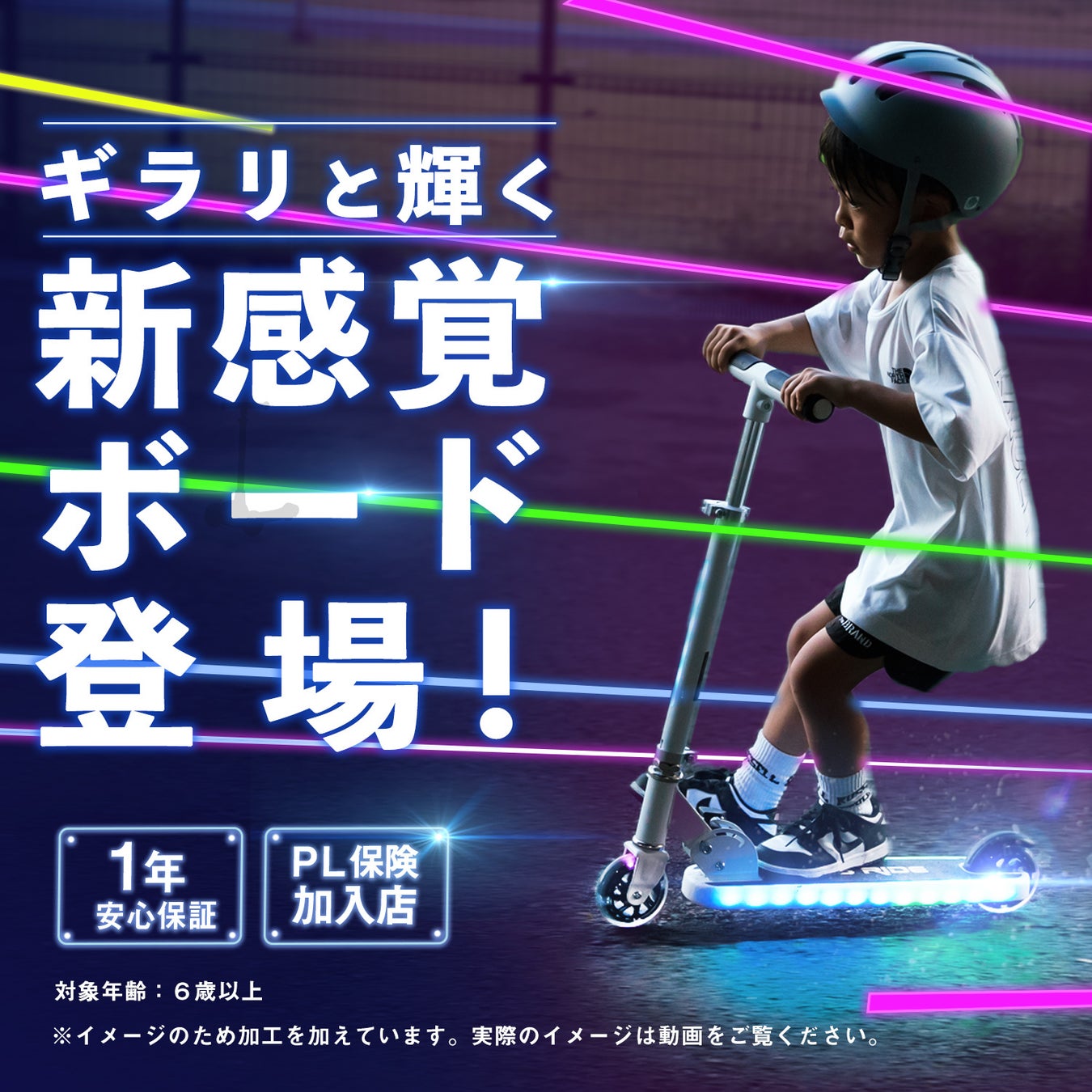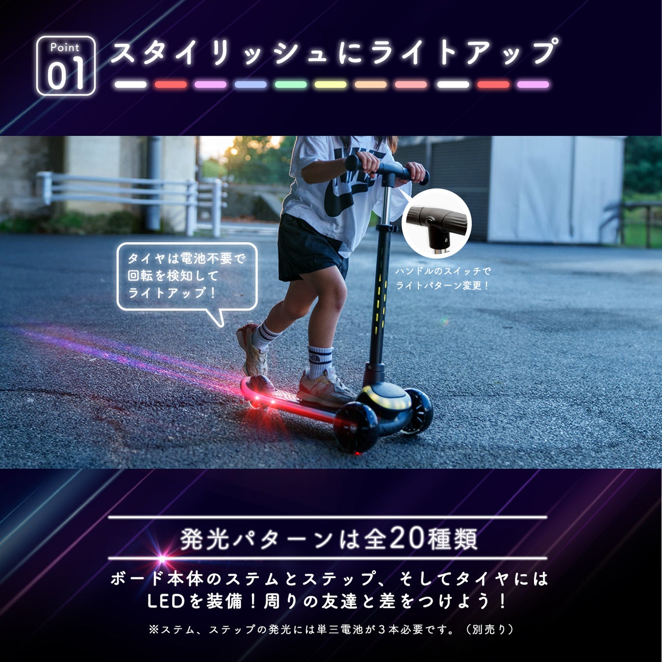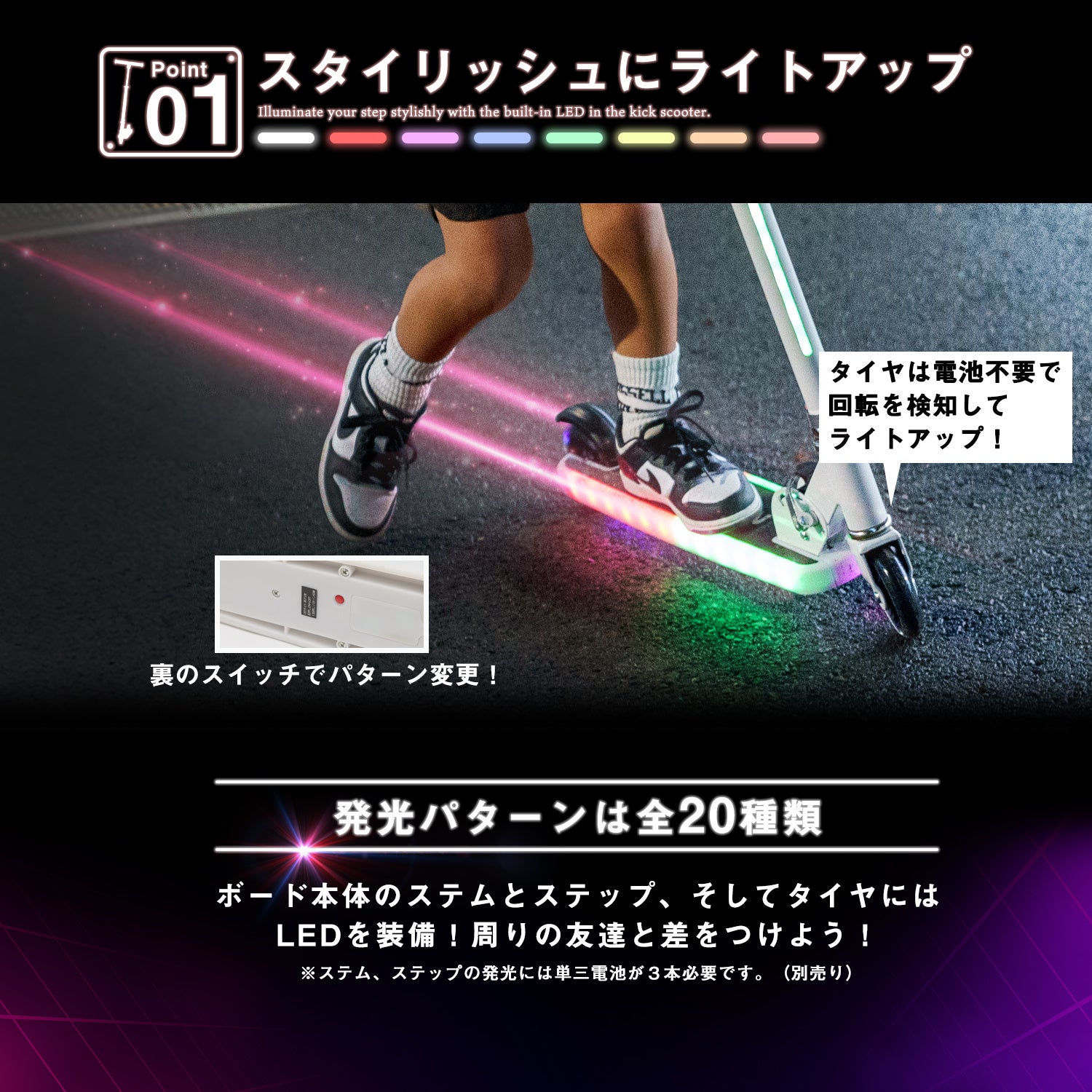20ものパターンでピカピカと光り輝く、これまでに無い子ども用のキックボードです。