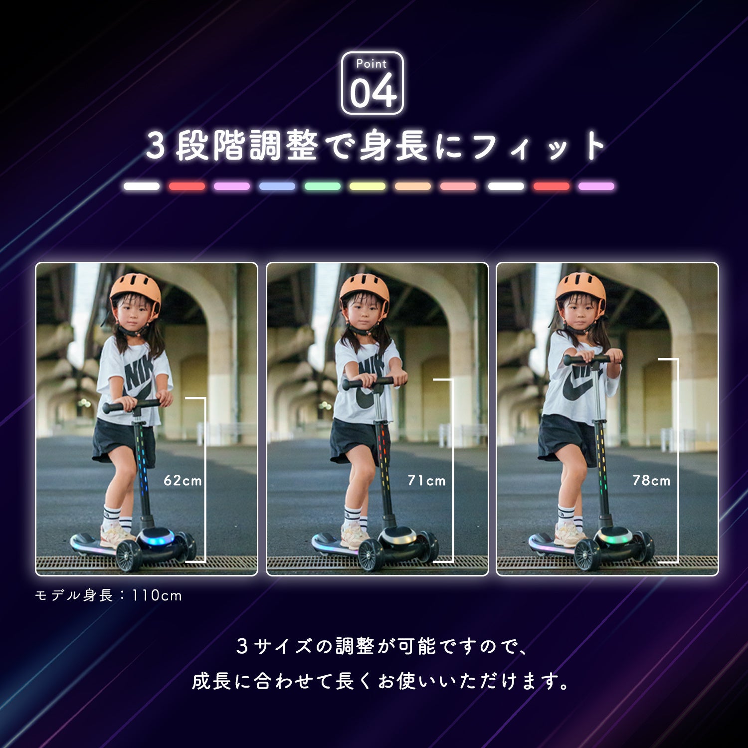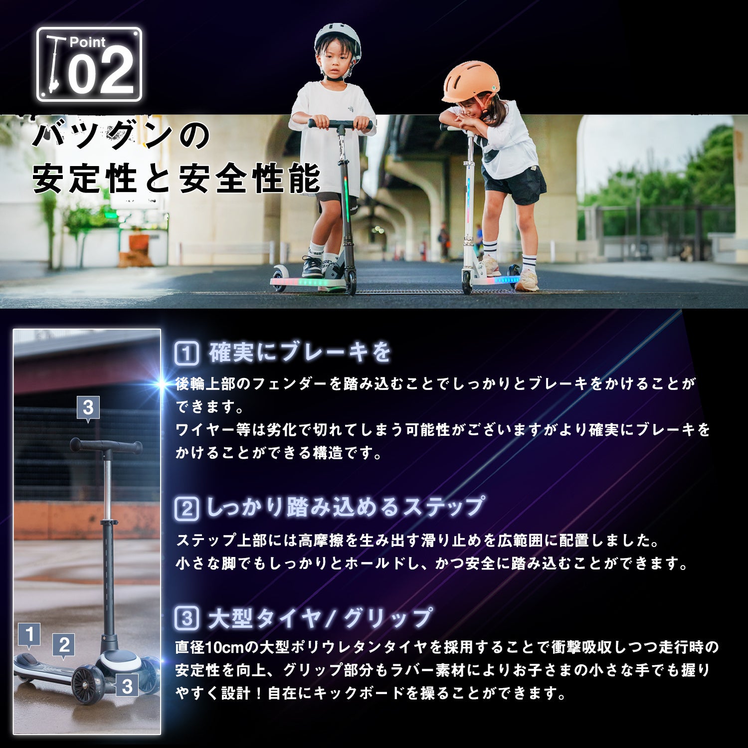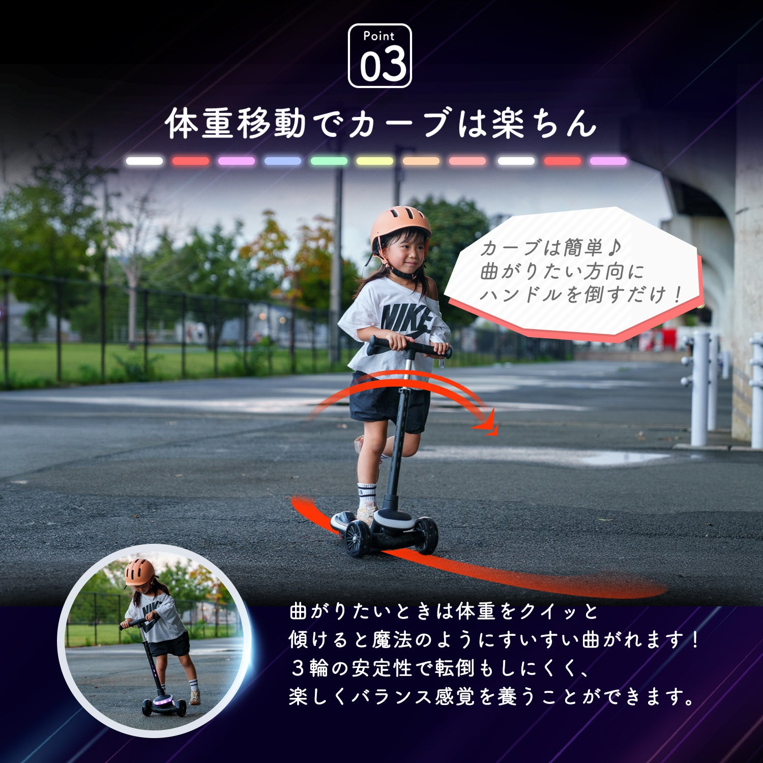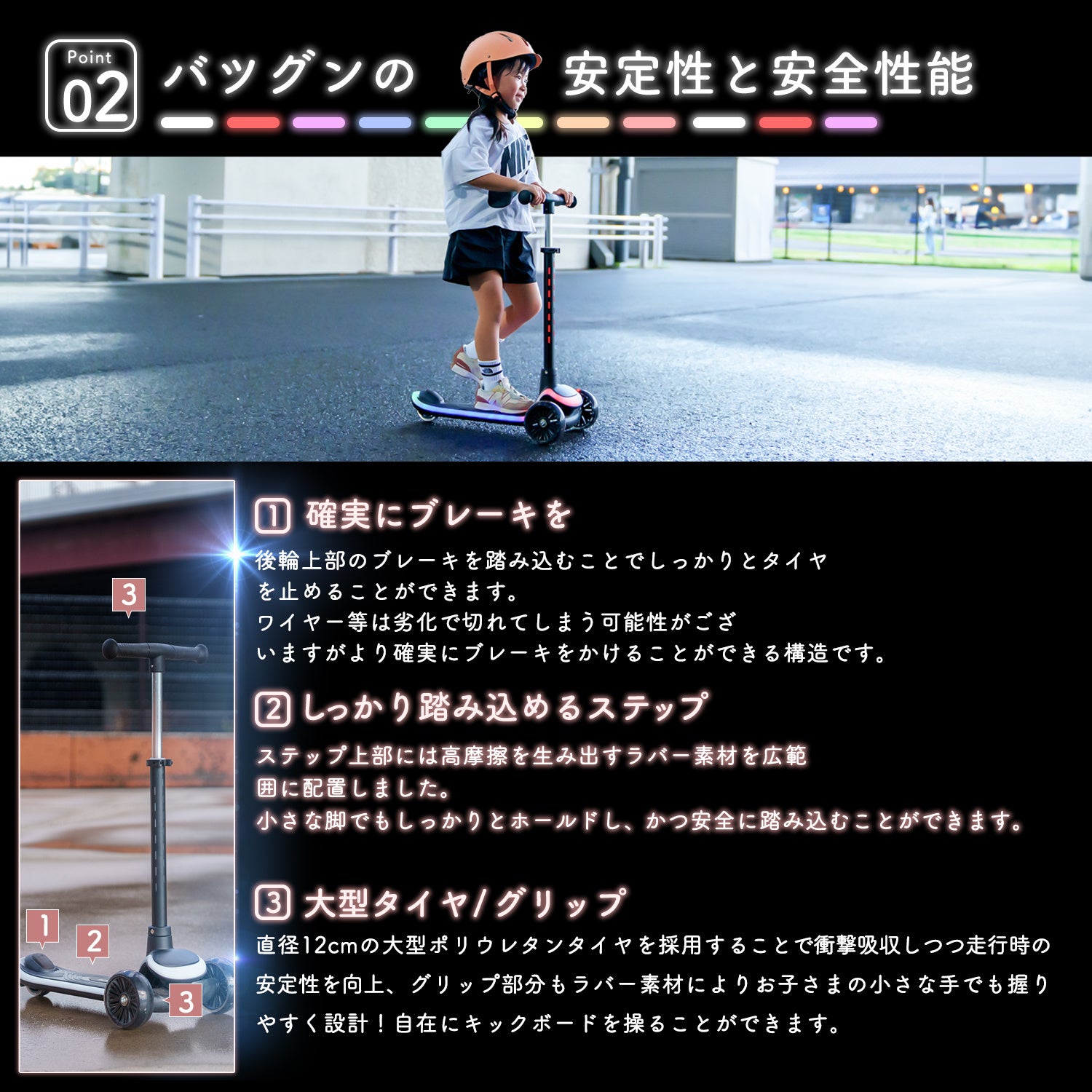 20ものパターンでピカピカと光り輝く、これまでに無い子ども用のキックボードです。