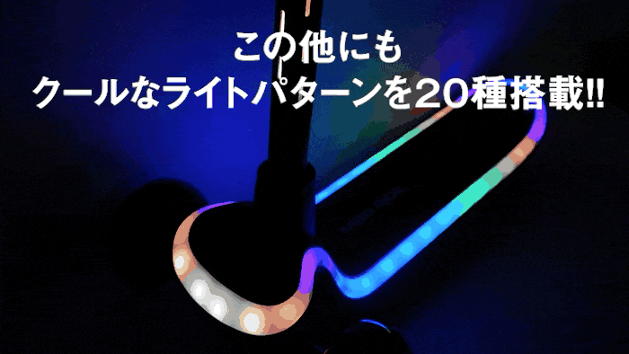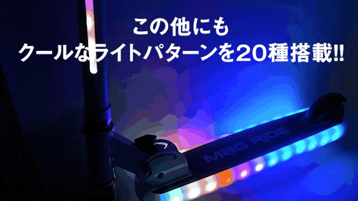 フラッシュマグライダーのLEDライトパターンは20パターン! ボタンを押すだけでライトのパターンを切り替え、自分好みのパターンでキックボードを光らせる事が出来ます。