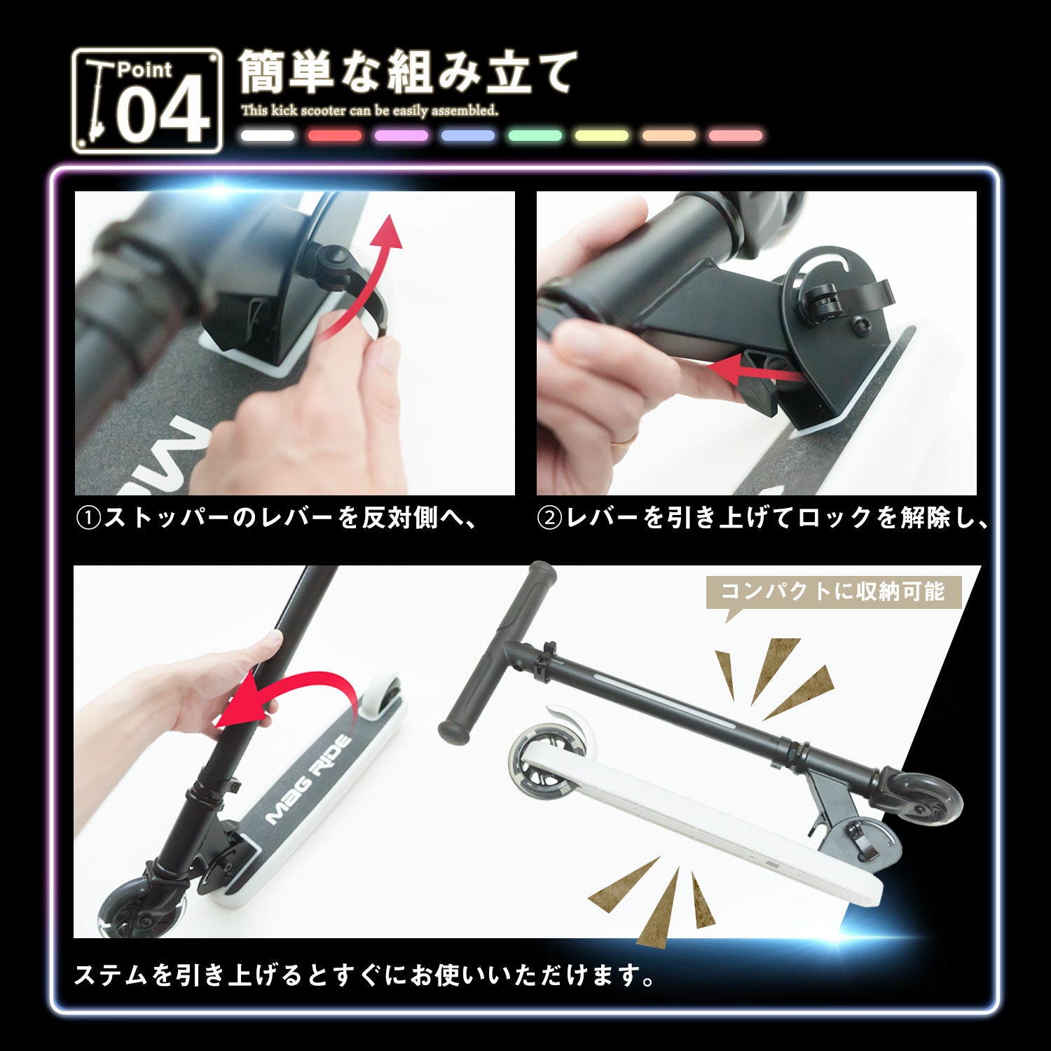 MagRideのフラッシュマグライダーはハンドルフレーム部分とデッキ部分が連動して七色に輝きます。