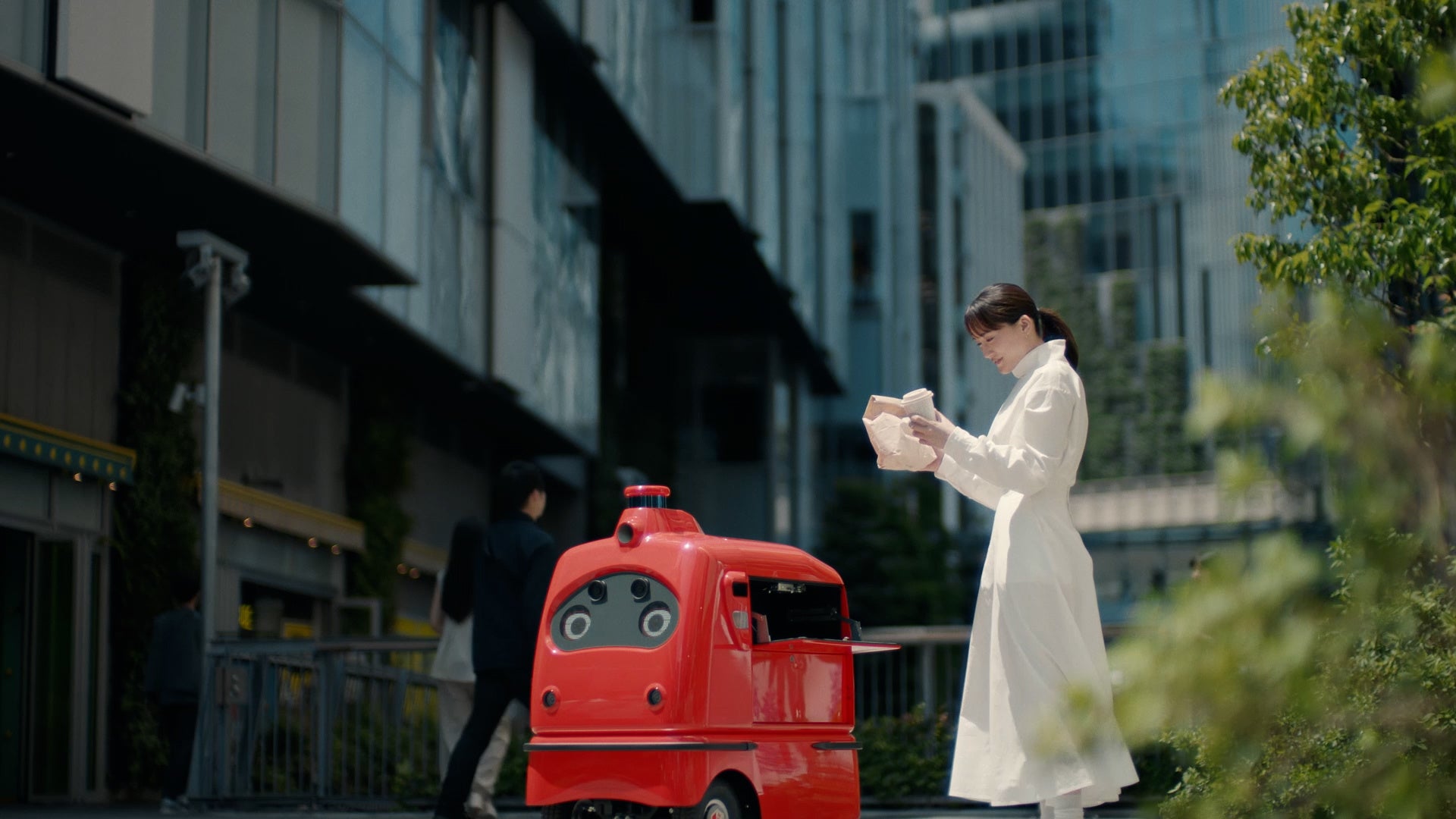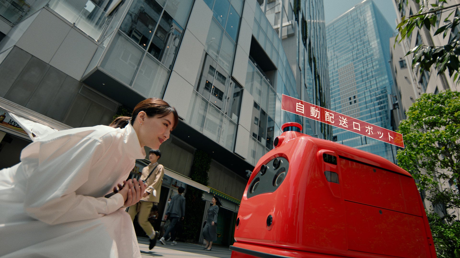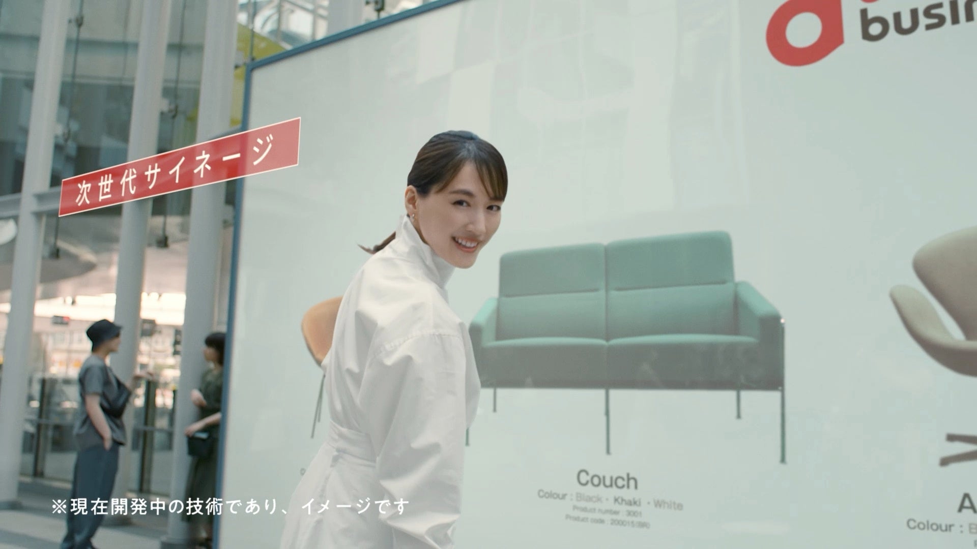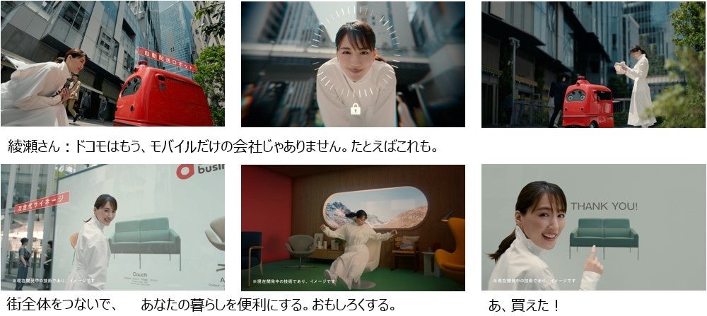 新CMは、「ドコモはもう、モバイルだけの会社じゃありません」という印象的な台詞とともに、綾瀬はるかさんが颯爽と街を歩くシーンから始まります。最初に出会ったのは、可愛らしい表情と赤いフォルムが特徴的な自動配送システムのロボット。モバイルオーダーされたフードやドリンクなどを自動で配送し、綾瀬さんの顔を認証して商品をスマートに届けます。続いて大きな次世代サイネージの前に立つと、サイネージが綾瀬さんを認識して好みに似合う商品を自動で表示。サイネージの中で気に入ったソファーに出会った綾瀬さんは、ワンタッチで商品を購入し「あ、買えた!」と嬉しそうな表情を見せます。