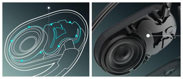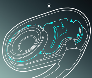 音の出口をドライバーユニット正面に突き出るよう配置し、音漏れの抑制を図りました。音が直接耳穴の方向へ向かうことで、音漏れの抑制だけでなく、小音量でも音楽や通話音声がクリアに聴こえるメリットを得られます。