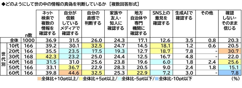 世代別にみると、「SNS上の意見を確認する」は若年層で高くなる傾向がみられ、10代では18.1%、20代では18.7%と、全体と比べて5ポイント以上高くなりました。他方、20代では「確認しない・そのまま信じる」が30.7%と、他の世代と比べて特に高くなりました。