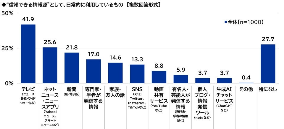 全回答者(1,000名)に、“信頼できる情報源”として、日常的に利用しているものを聞いたところ、「テレビ(ニュース番組・ワイドショー含む)」(41.9%)が最も高くなり、「ネットニュース・ニュースアプリ(Yahoo!ニュース、スマートニュースなど)」(25.6%)、「新聞(紙・電子版)」(21.8%)、「専門家・学者が発信する情報」(17.0%)、「家族・友人の話」(14.6%)が続きました。