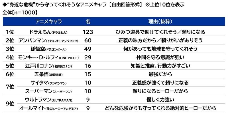 また、“身近な危機”から守ってくれそうなアニメキャラを聞いたところ、1位「ドラえもん(ドラえもん)」(123名)、2位「アンパンマン(それいけ!アンパンマン)」(60名)、3位「孫悟空(ドラゴンボール)」(49名)、4位「モンキー・D・ルフィ(ONE PIECE)」(29名)、5位「江戸川コナン(名探偵コナン)」(16名)となりました。