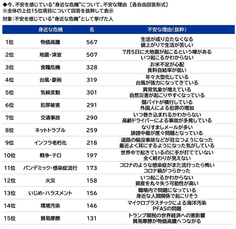 不安を感じている“身近な危機”として挙げた人に、不安な理由をそれぞれ聞いたところ、1位の物価高騰では「生活が成り立たなくなる」「値上がりで生活が苦しい」、2位の地震・津波では「7月5日に大地震が起こるという噂がある」「いつ起こるかわからない」、3位の食糧危機では「お米不足が心配」「食料自給率が低い」、4位の台風・豪雨では「年々大型化している」「台風が強力になってきている」、5位の気候変動では「異常気象が増えている」「自然災害が起こりやすくなっている」といった回答が挙げられました。