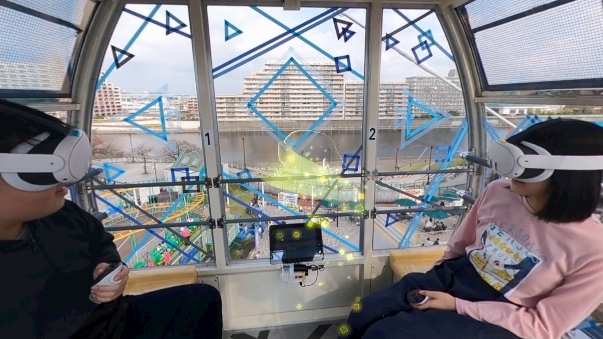 「XR観覧車」では、観覧車のゴンドラに搭乗する際に、MRヘッドセット「Meta Quest 3」を装着します。Meta Quest 3の内部では、現実の風景とCG映像を合成して表示できます。これにより、搭乗者は観覧車からの雄大な景観を味わいつつ、CGならではのインタラクティブで美しい演出を体感できます。