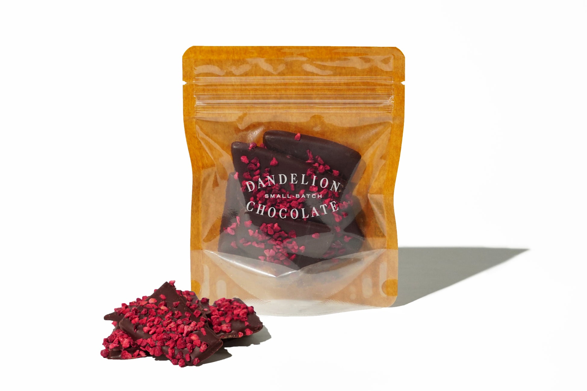 「ラズベリートフィーチョコレート」が登場。サクサクのバターキャラメルを、ドミニカ共和国産カカオ70%の濃厚なチョコレートで包み込み、表面に無添加・無着色のドライラズベリーをトッピングしました。
