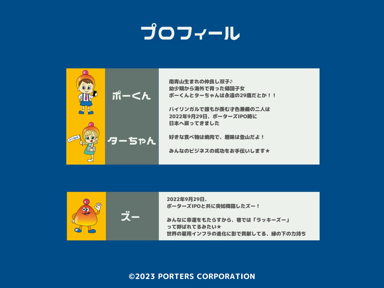 公式キャラクターは、ポーターズ株式会社の認知向上に向けて活動し、たくさんの皆様に愛されるキャラクターとなれるよう、オリジナルグッズの制作、キャラクターを起用した商品やCM 展開等、様々な情報発信を行ってまいります。今後の活躍にぜひご期待ください。