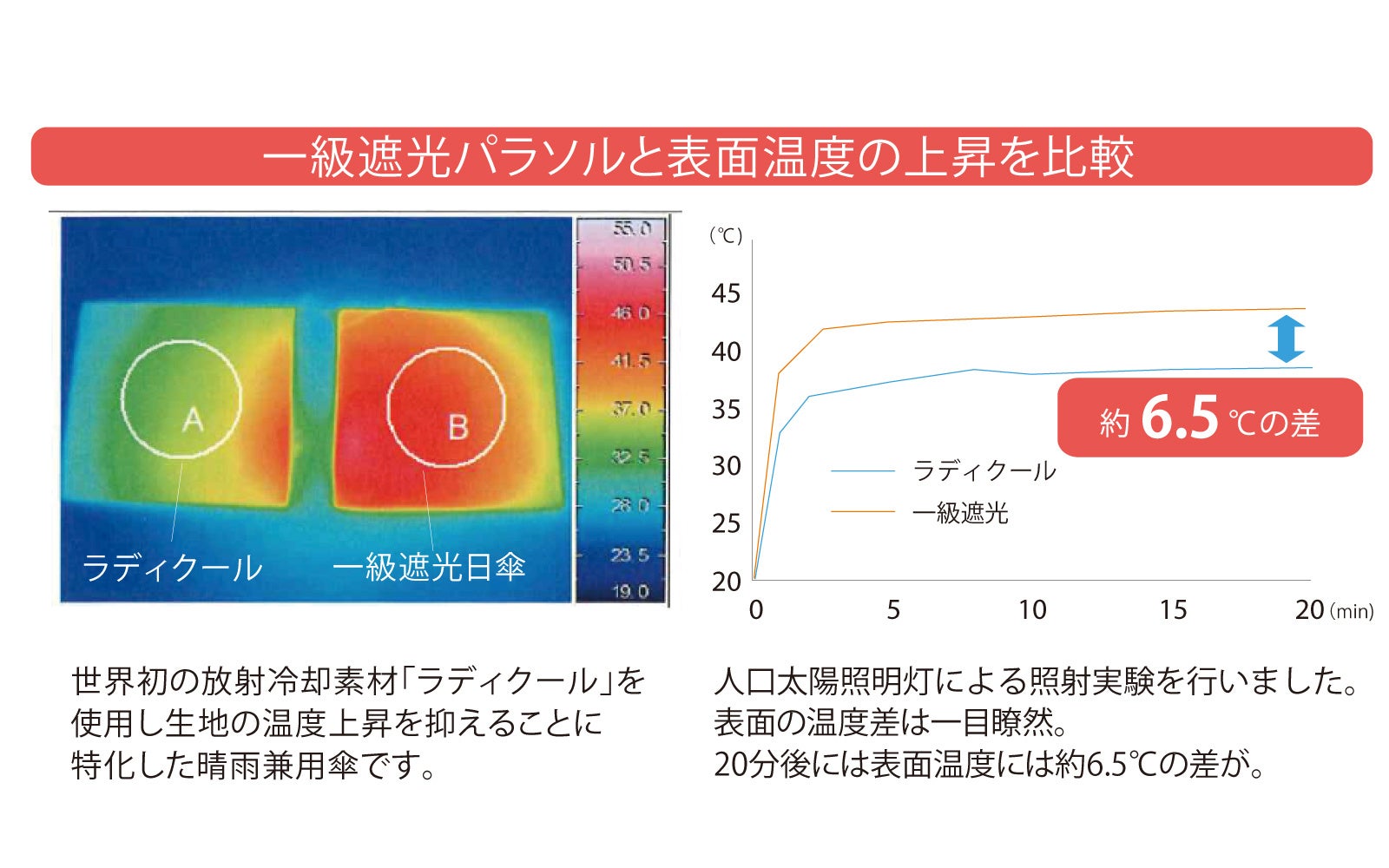 一級遮光パラソルと表面温度の上昇を比較。人工太陽照明灯による照射実験を行ったところ、20分後には表面温度に約6.5度の差が発生。炎天下でも快適に過ごせます。
