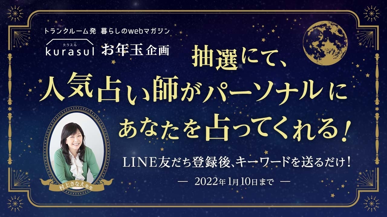 全国でトランクルームを展開し『ハローストレージ』を運営しているエリアリンク株式会社(東証2部:8914)は、運営する情報サイト『kurasul(クラスル)』にて抽選で2名様に村上さなえ先生が2022年の運勢を占ってくれる『お年玉キャンペーン』を実施します。