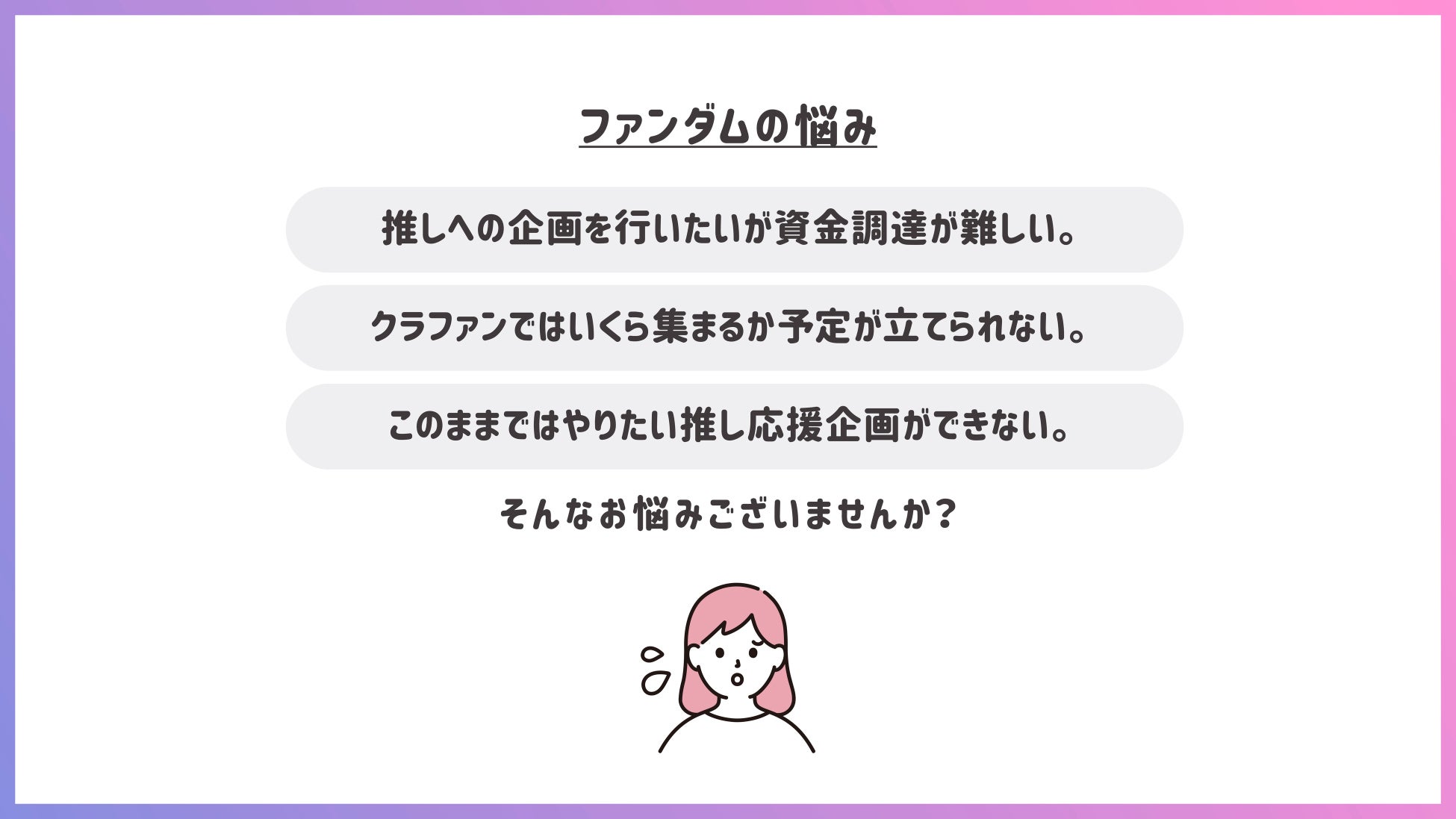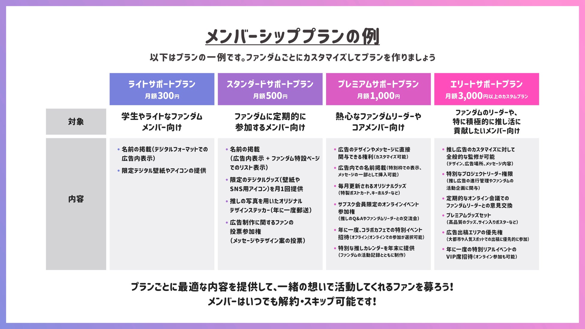 推し活を行うファンダム運営者が、より計画的かつ安全に活動資金を集め、推し広告などの応援企画を実現するための新たなサービスです。