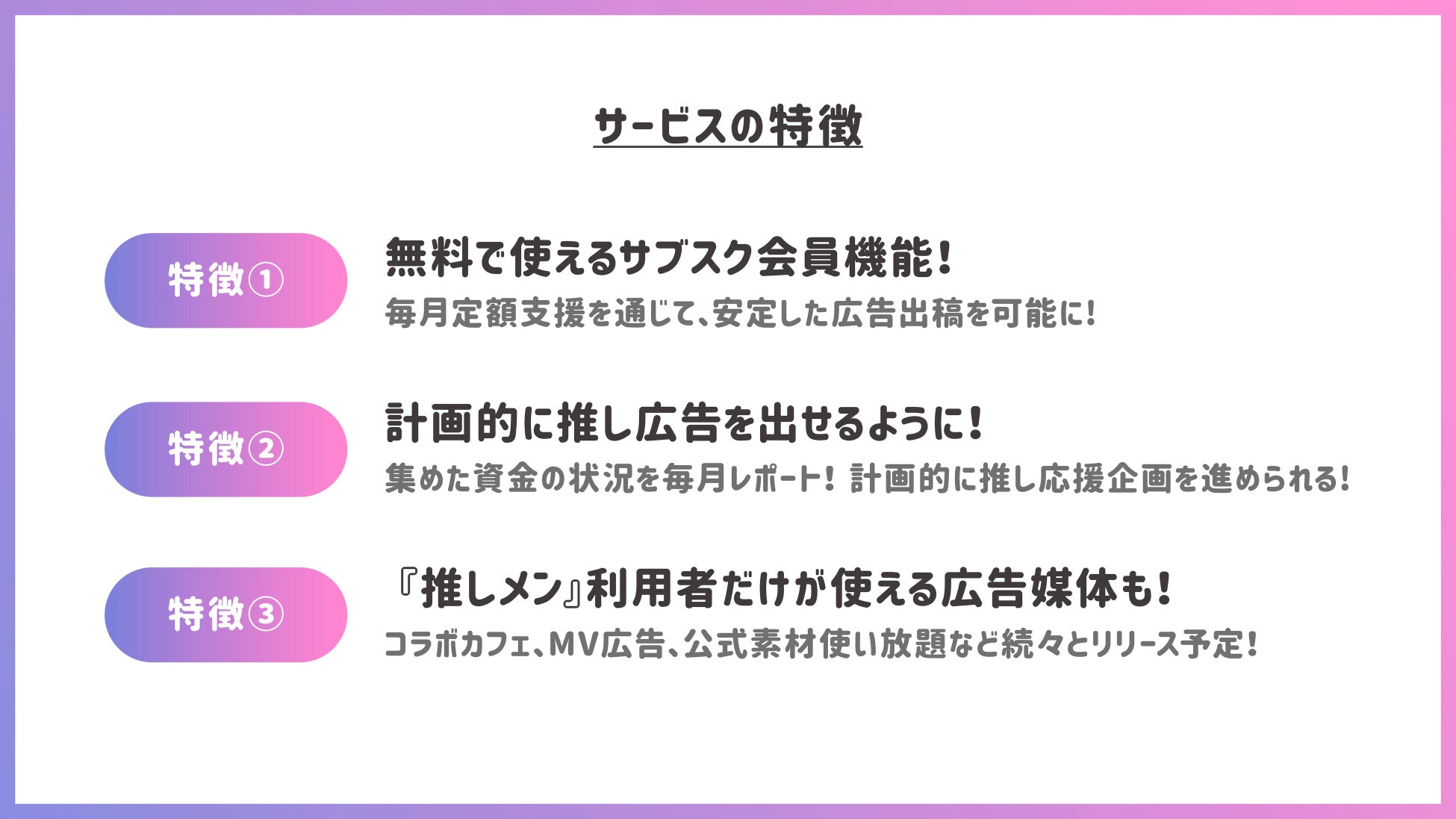 弊社は「誰でも簡単に推し広告」のコンセプトのもと、新サービス『推しメン』など、ファンの推し応援活動を計画的に安全に行うためのツールを提供し続けます。