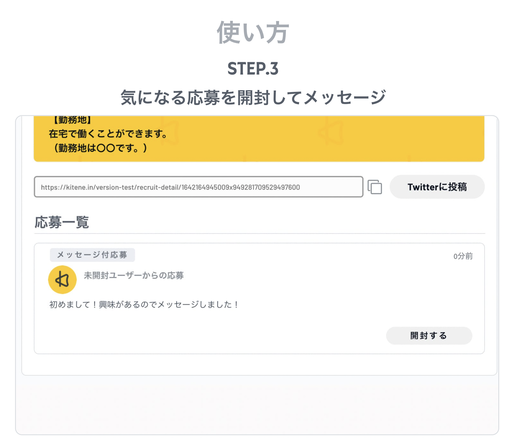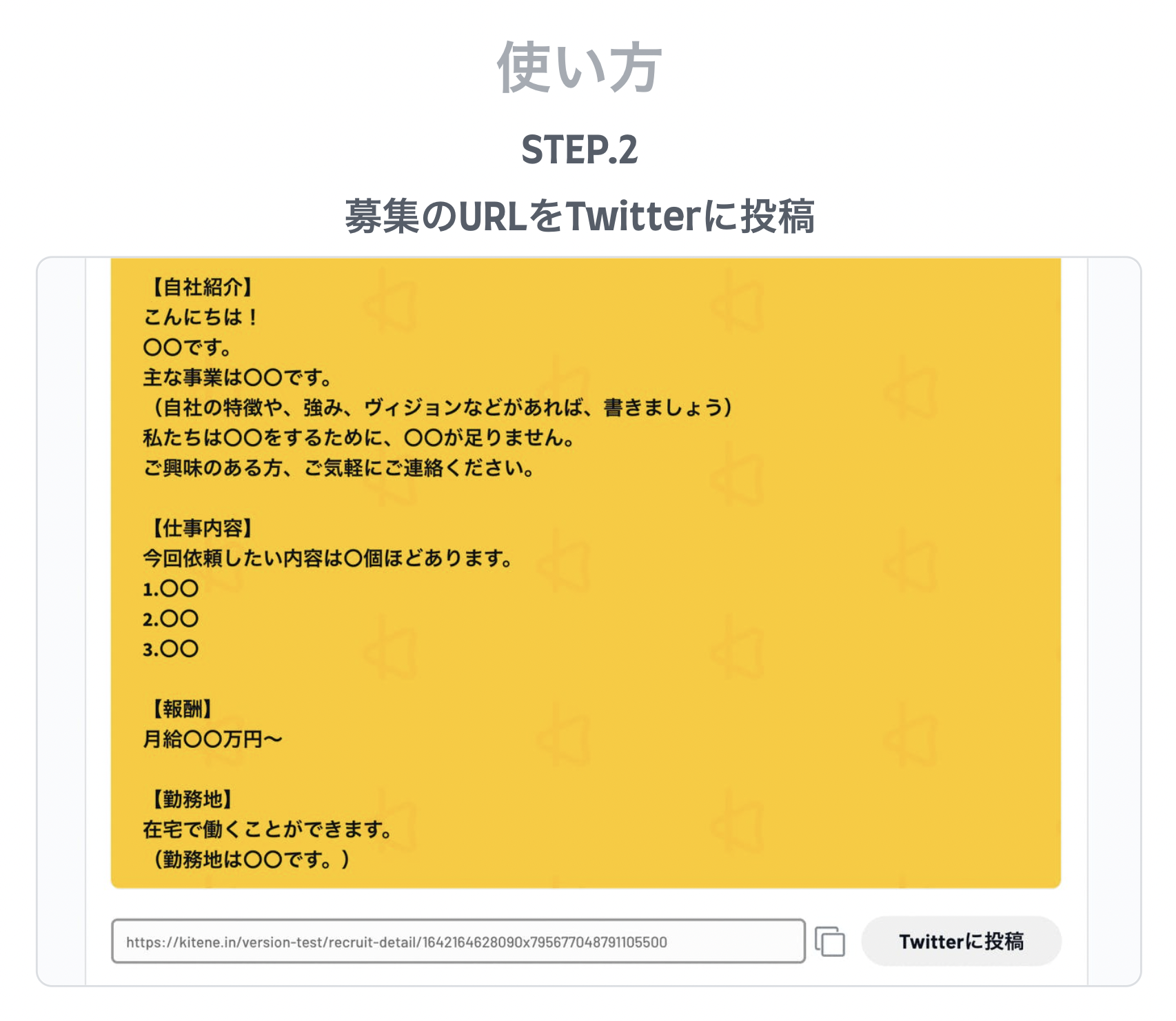 kiteneを利用して募集を投稿するメリットとして、Twitterの140文字という文字数制限に関係なく詳細を記載することができ、画像を活用して募集内容が表示できます。