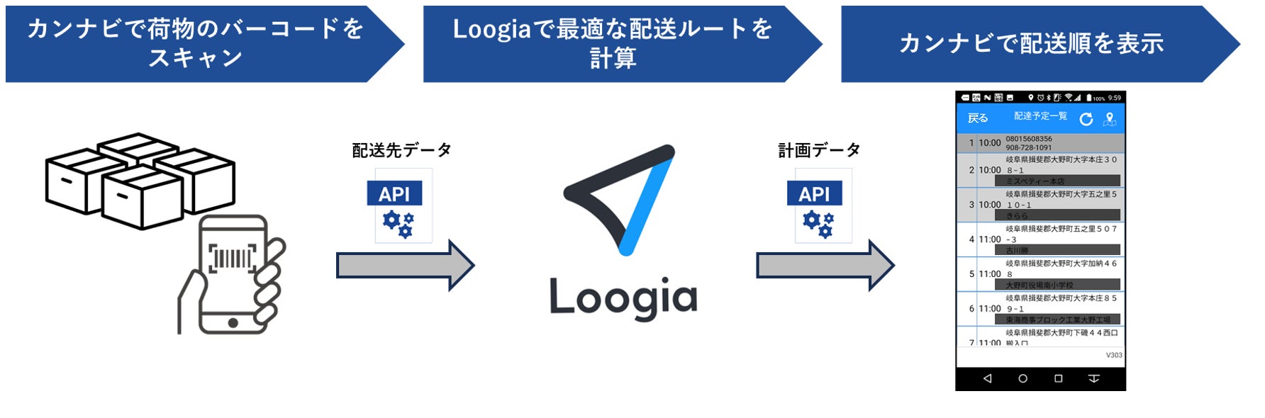 現在、西濃運輸では配達先位置情報を管理するアプリ(カンナビ)を利用しているものの、配達コース順はドライバーの経験に基づき決定しており、属人的な運用となっています。今回の取組みにおいては、カンナビとLoogiaをAPIで連携し、AIやアルゴリズムを使用した配送ルートの作成業務を自動化します。これにより、属人的な運用の解消及び配送ルート作成の効率化、配送時間やCO2削減を目指していきます。また、新人ドライバーでも最適な配送ルートを組むことができます。