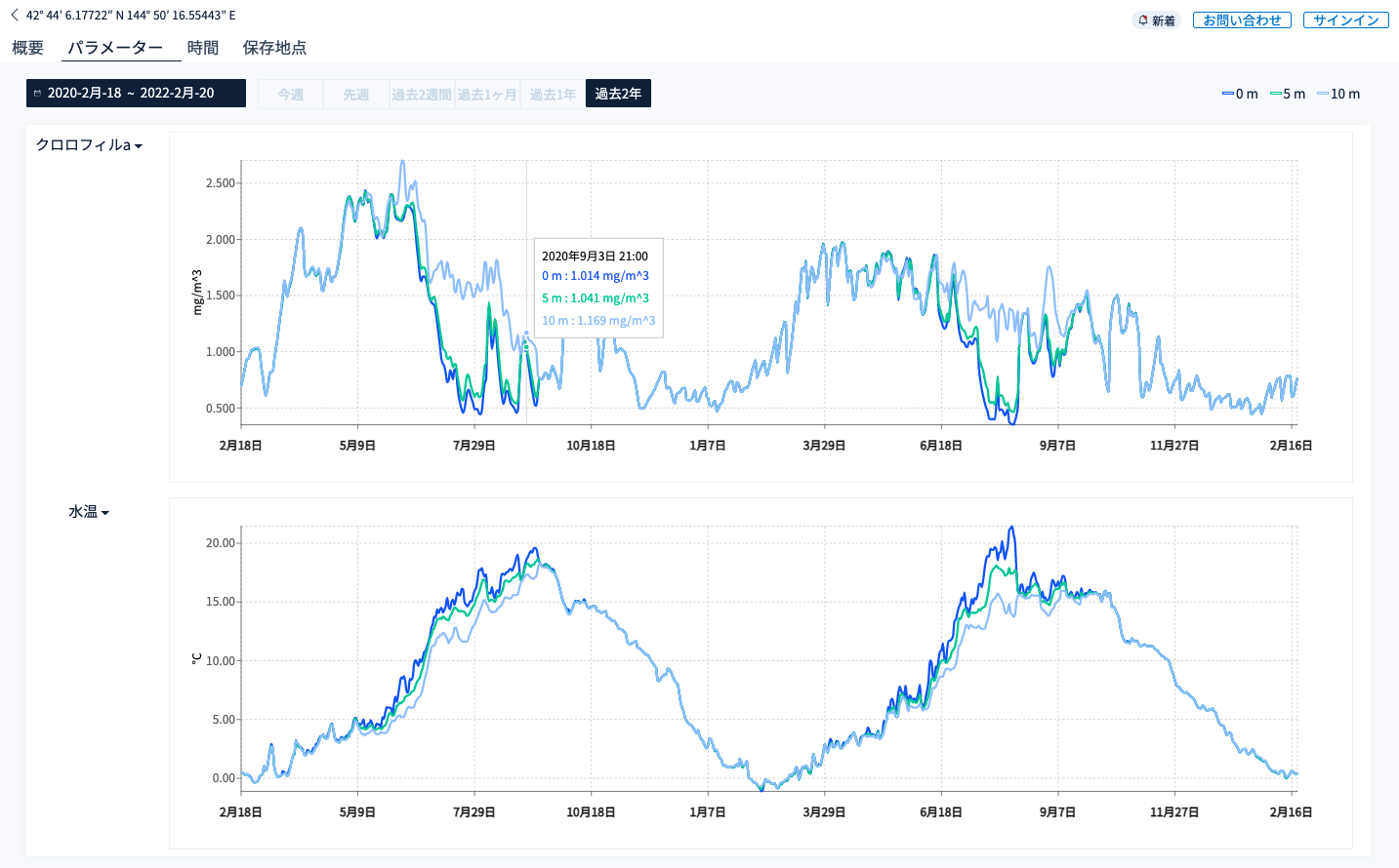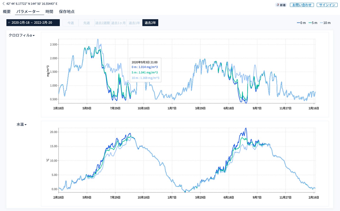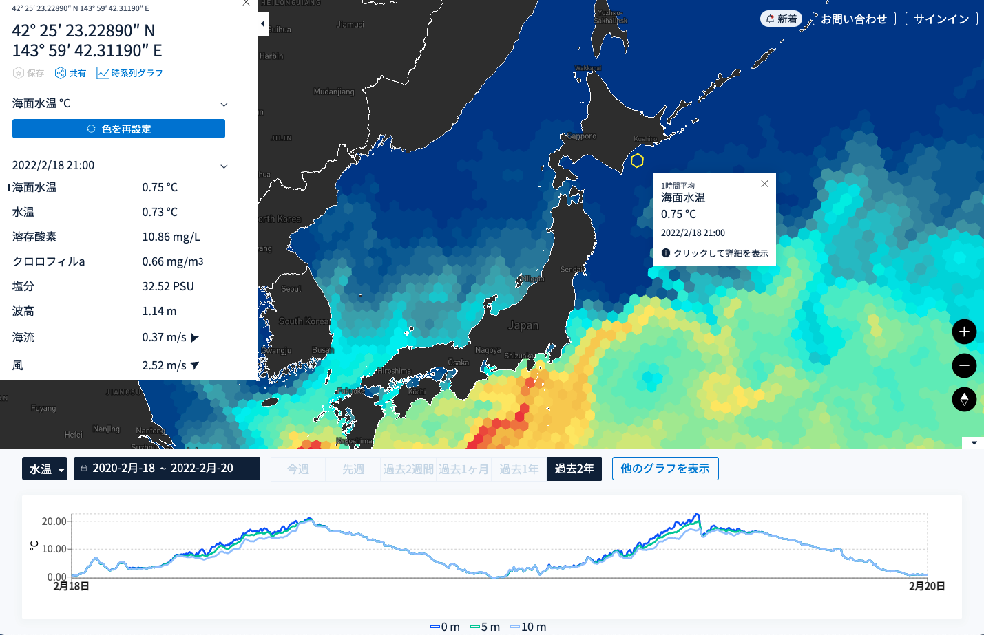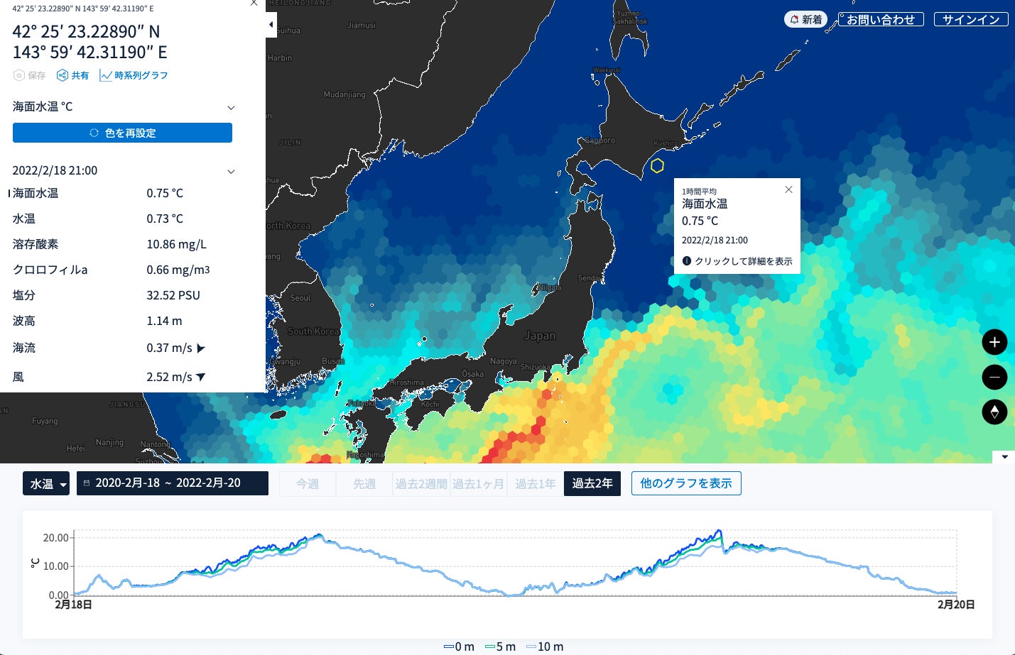 水産養殖向け海洋データサービス「UMITRON PULSE」。過去2年分の全地球の海洋環境データのモニタリングが可能(期間限定で全ユーザー無料提供中)。長期データを活用することで、海藻や海草をはじめとした主要養殖魚種の生育適正域の算出にも利用できる。https://www.pulse.umitron.com/home