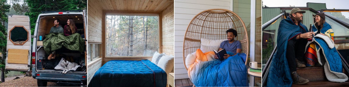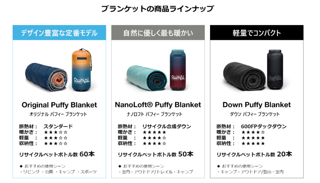 デザインだけじゃない!高い機能性と地球に優しい生産を追求したRUMPL。キャンプや車中泊で、シュラフカバーや布団のようにかけたり、肌寒い時にケープのように羽織ったり、ひざ掛けにしたり、場所やシーンを選ばずにお使いいただけます。コンパクトに収納でき持ち運びも簡単なので、家族に1枚あるととても便利です。素材による商品ラインナップは3種類。使い方や機能、サイズによって選べます。