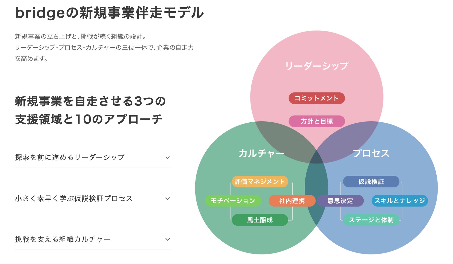 bridgeが新たに提唱している、「新規事業を自走させる3つの支援領域と10のアプローチ」について、具体的に伝えるページを作成しました。リーダーシップ・プロセス・カルチャーの三位一体で、企業の自走力を高めるメソッドと実践事例を紹介しています。