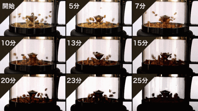 ガラス製の容器でコーヒー豆の焙煎経過を確認しながら、焙煎1~25分、冷却1~15分まで時間調節すること