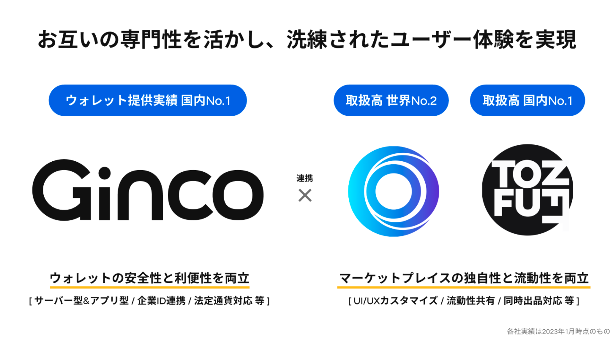本パートナーシップでは、これまでWeb3 Development Companyとして、企業のWeb3事業創出を支援するインフラを提供しており、特に暗号資産やNFTを管理する「ウォレット」の分野では、暗号資産交換業者への導入シェアNo.1など、国内トップの実績を有しているGincoとこれらの認識を共有し、双方の開発・提供するホワイトラベルソリューションの連携を強化します。