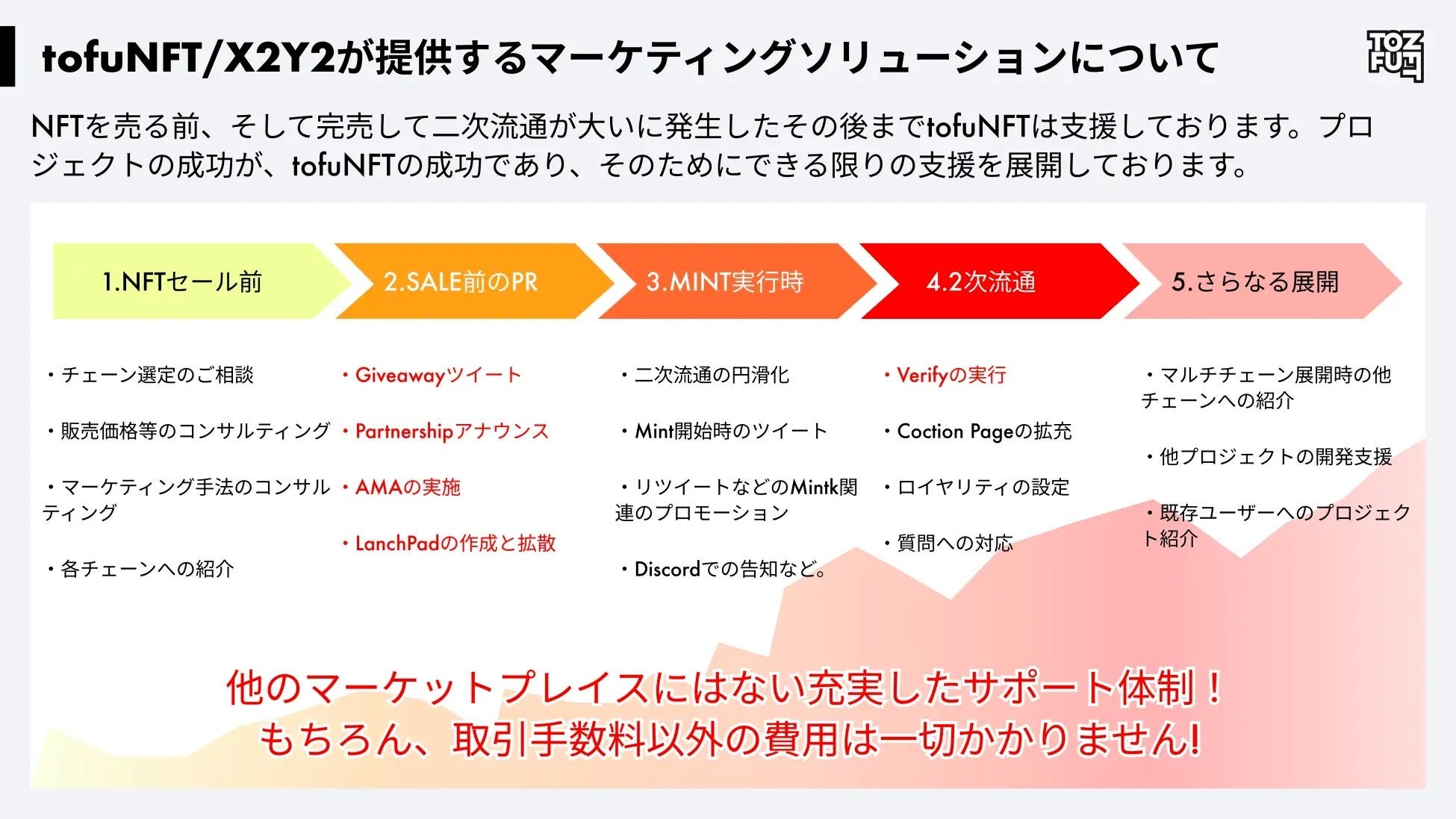 またtofuNFTではWhite labelとしてマーケットプレイス自体を提供しておりますので、自社でマーケットプレイス開発等をお考えの事業者様は一度ご相談いただけますと幸いです。世界レベルのNFTマーケットプレイスが保有する機能群を備えた上で、独自開発などが可能となっております。連絡先は、contact@tofunft.com宛もしくは日本語コーポレートサイトにお問合せ(https://service.tofunft.com/)にお願いいたします。