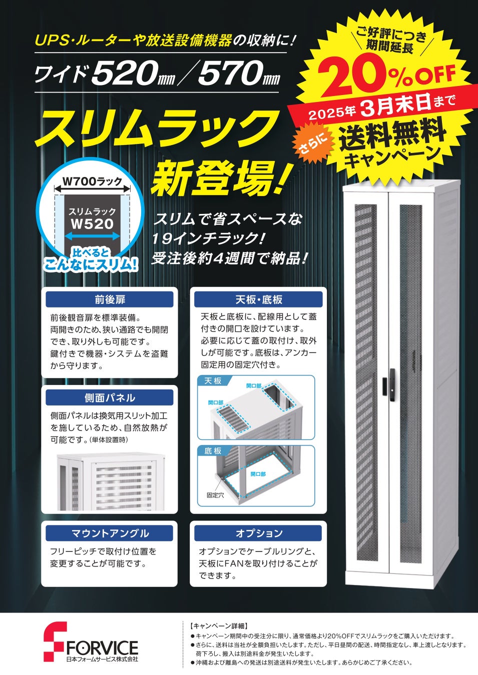 本キャンペーンでは、コンパクトな設置スペースでも高い収納力を発揮するスリムラックを、通常価格よりもお得に提供します。スペースの有効活用が求められるオフィスやデータセンター、工場などに最適なラック製品です。この機会に、多様な設置環境に対応可能なスリムラックの導入をご検討ください。